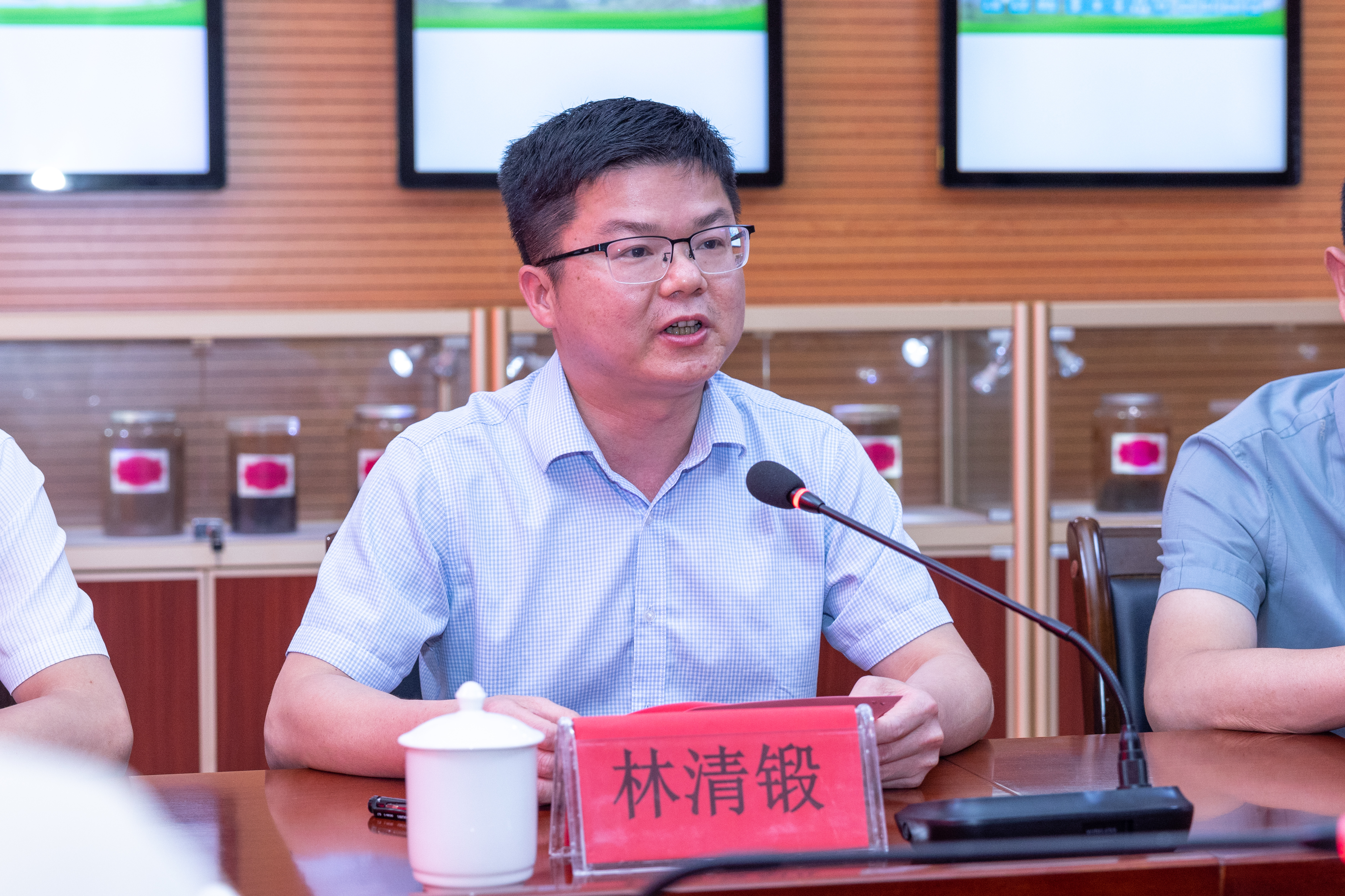 林清锻介绍了安溪县融媒体中心的发展历程、组织架构以及全媒体宣传矩阵阵容,在致辞中他强调了共建的三重意义,一是深化“党业融合”,建立常态化党团联建机制,联合开展“党建引领乡村振兴”“茶文化传承”等主题宣传,组织师生记者深入基层挖掘茶乡故事,服务地方发展;二是搭建“创新平台”,通过互设“校地合作基地”,整合宣传展示与内容创作功能。中心助力学校推广茶业、光电科研成果,借助学校学术资源提升报道专业深度,共探新技术应用; 三是共筑“人才舞台”,中心为茶学院学生提供新闻采编、短视频制作等实习岗位,配备业务导师“一对一”指导。支持学生参与乡村振兴等主题项目实战,合力培育兼具专业素养与实践能力的传媒生力军。
