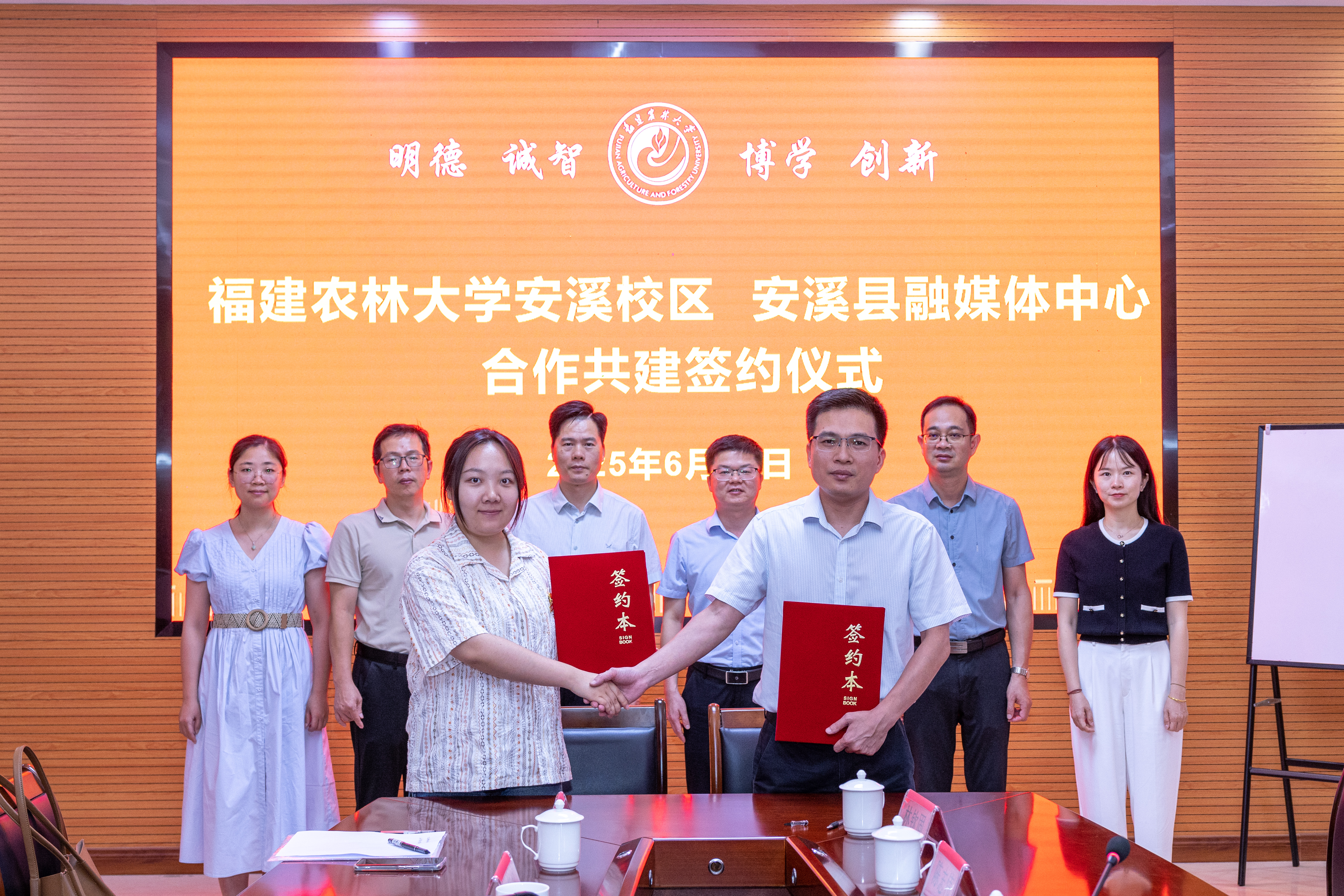 6月25日下午,安溪茶学院团学组织党支部与安溪县融媒体中心党支部党建结对共建签约仪式在安溪校区协同创新中心举行。安溪茶学院党委书记黄成茂,安溪茶学院党委副书记张云帆,安溪县融媒体中心主任林清锻,安溪县融媒体中心副主任谢永茂、陈志伟、颜桂云,安溪茶学院政工干部以及安溪县融媒体各部门负责人一同参与活动。活动由张云帆主持。