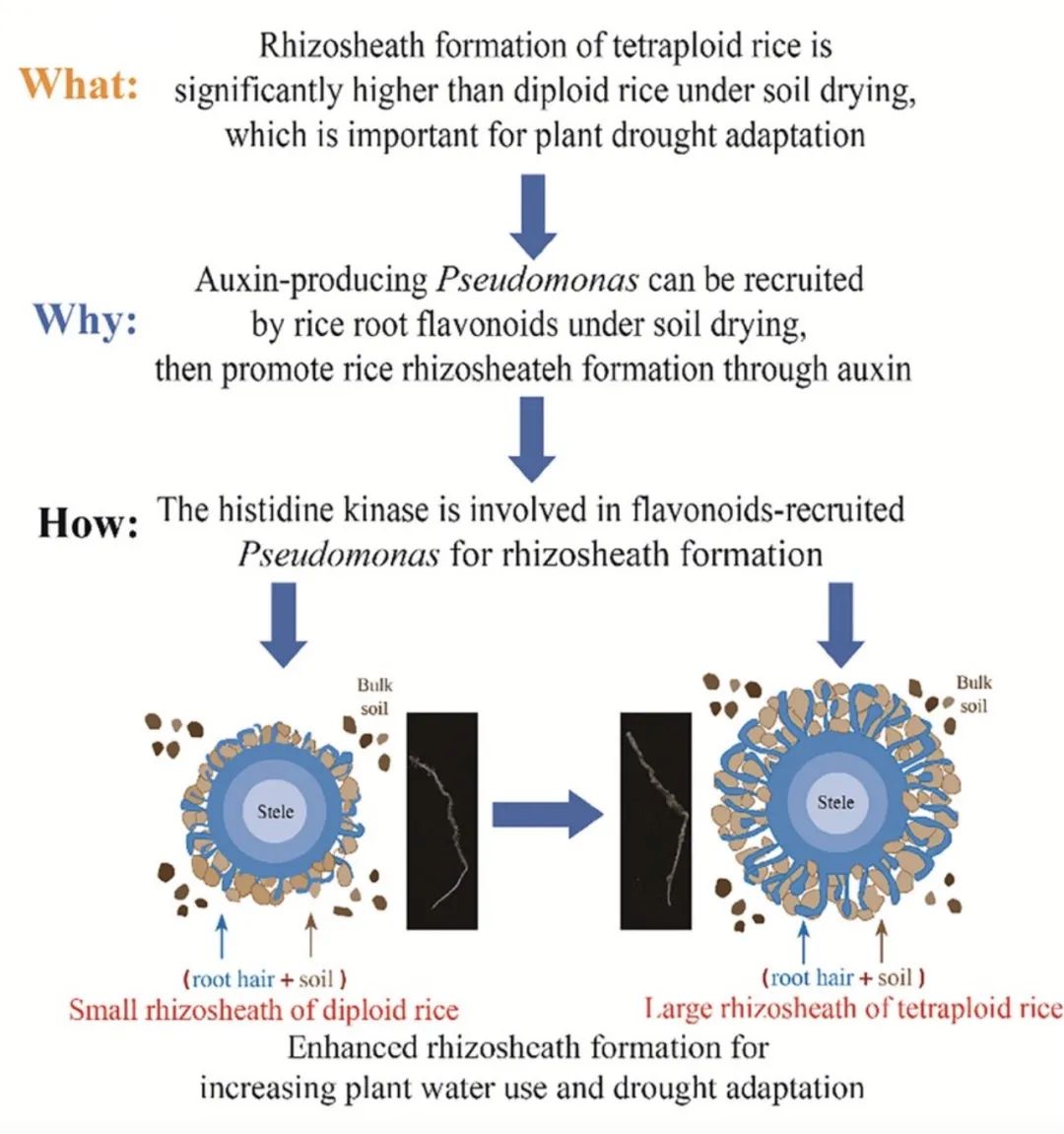该研究旨在探究土壤干旱条件下根系分泌物及微生物在水稻根鞘形成中的作用。在多倍体水稻中,土壤干旱条件下的根鞘建成比二倍体水稻高出约70%。用多倍体水稻的根鞘土壤微生物群接种二倍体水稻,可显著增强其在土壤干旱条件下的根鞘建成。为了确定微生物在土壤干旱期间根鞘建成中的作用,研究者探究了存在于二倍体和多倍体水稻叶际、根际、根鞘以及根内的细菌群落。发现假单胞菌属(Pseudomonas)是促进土壤干旱条件下多倍体水稻根鞘建成的关键分类单元。在土壤干旱条件下,多倍体水稻的根系黄酮类化合物浓度显著高于二倍体水稻。过表达查尔酮合成酶基因(OsCHS1)—黄酮类化合物生物合成的关键基因—导致二倍体水稻中Pseudomonadaceae的丰度显著增加。从多倍体水稻根鞘中分离的Pseudomonas nitroreducens表现出对黄酮类化合物的趋化性,但在其组氨酸激酶突变体ΔcheA中未观察到该行为。接种P.nitroreducens及其IAA合成互补菌株ΔiaaM-c的二倍体和多倍体水稻,在土壤干旱条件下形成的根鞘比接种其IAA合成缺陷突变体ΔiaaM的水稻更大。研究结果证明,植物多倍性可通过根系黄酮类化合物(flavonoid)的生物合成促进对本地土壤细菌的招募,从而在土壤干旱条件下增强水稻根鞘建成和提高水分利用效率。