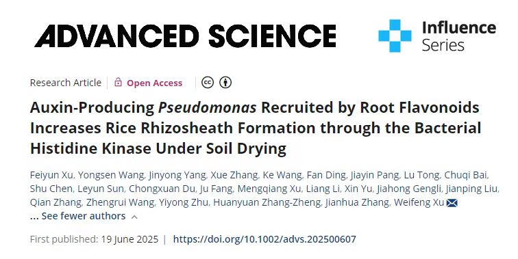2025年6月,开云网页版许卫锋团队/许飞云研究组在Advanced Science(先进科学)发表了题为Auxin-Producing Pseudomonas Recruited by Root Flavonoids Increases Rice Rhizosheath Formation through the Bacterial Histidine Kinase Under Soil Drying(根系类黄酮招募的假单胞菌促进水稻根鞘建成的机制)的研究论文,解析了根系黄酮类化合物招募的产生长素的假单胞菌,通过其组氨酸激酶在土壤干旱条件下增强水稻根鞘建成的微生物机制。研究结果可能有助于通过调控多倍体作物与有益土壤微生物的互作改善作物的环境适应性。