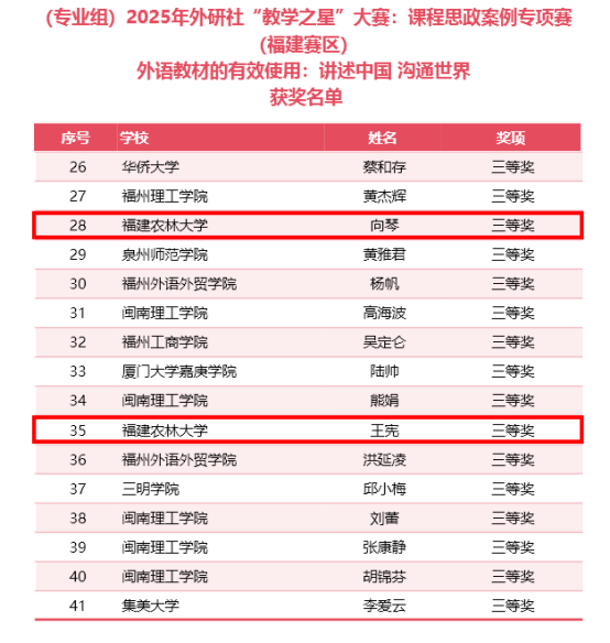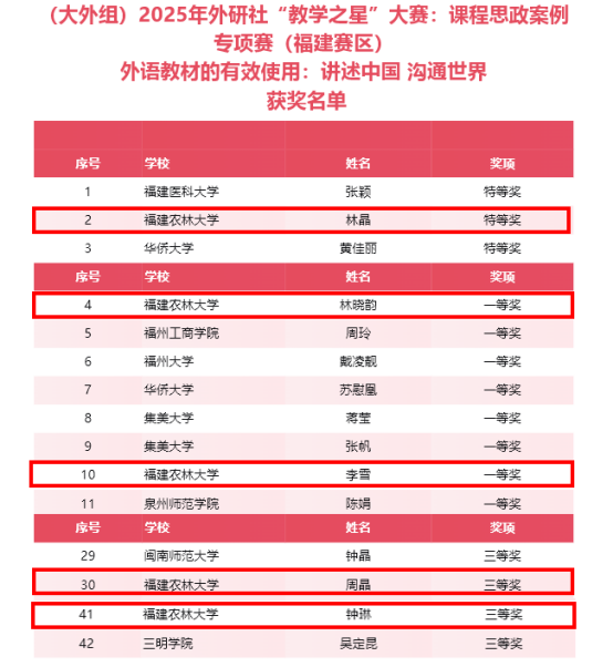 日前,2025年外研社“教学之星”大赛:课程思政案例专项赛(福建赛区)评选结果揭晓,戴尔豪西大学联合学院(国际学院)教师凭借卓越的教学设计、深厚的思政底蕴与创新理念,在众多参赛者中脱颖而出,一举斩获特等奖1项、一等奖2项、三等奖4项。