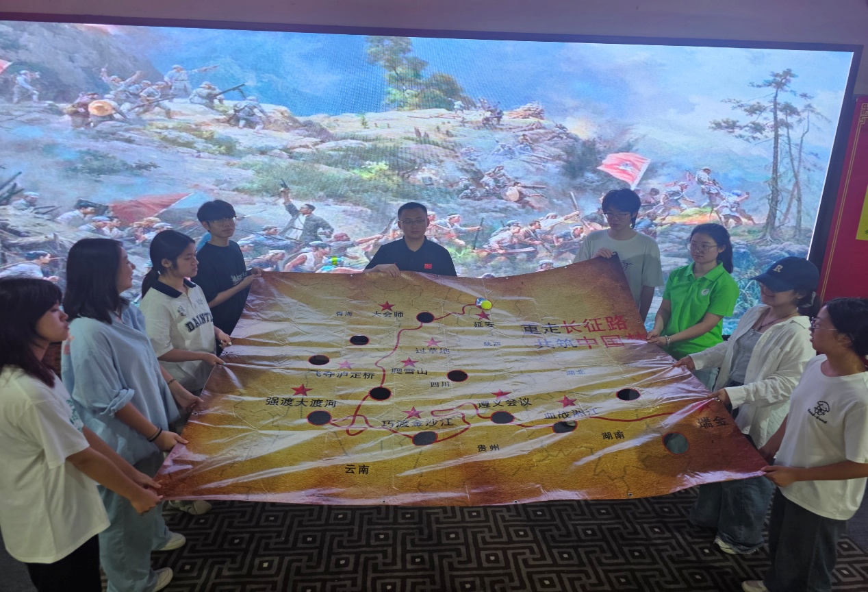党课结束后,实践队开展了红色主题团建活动。全体队员共同拼装了南湖红船模型、用一支笔书写“不忘初心”四个大字、采用地图滚球的方式重走长征路。在团建活动中,队员们与红船精神共鸣,加强了团队协作,追寻初心使命,感悟长征精神内涵。