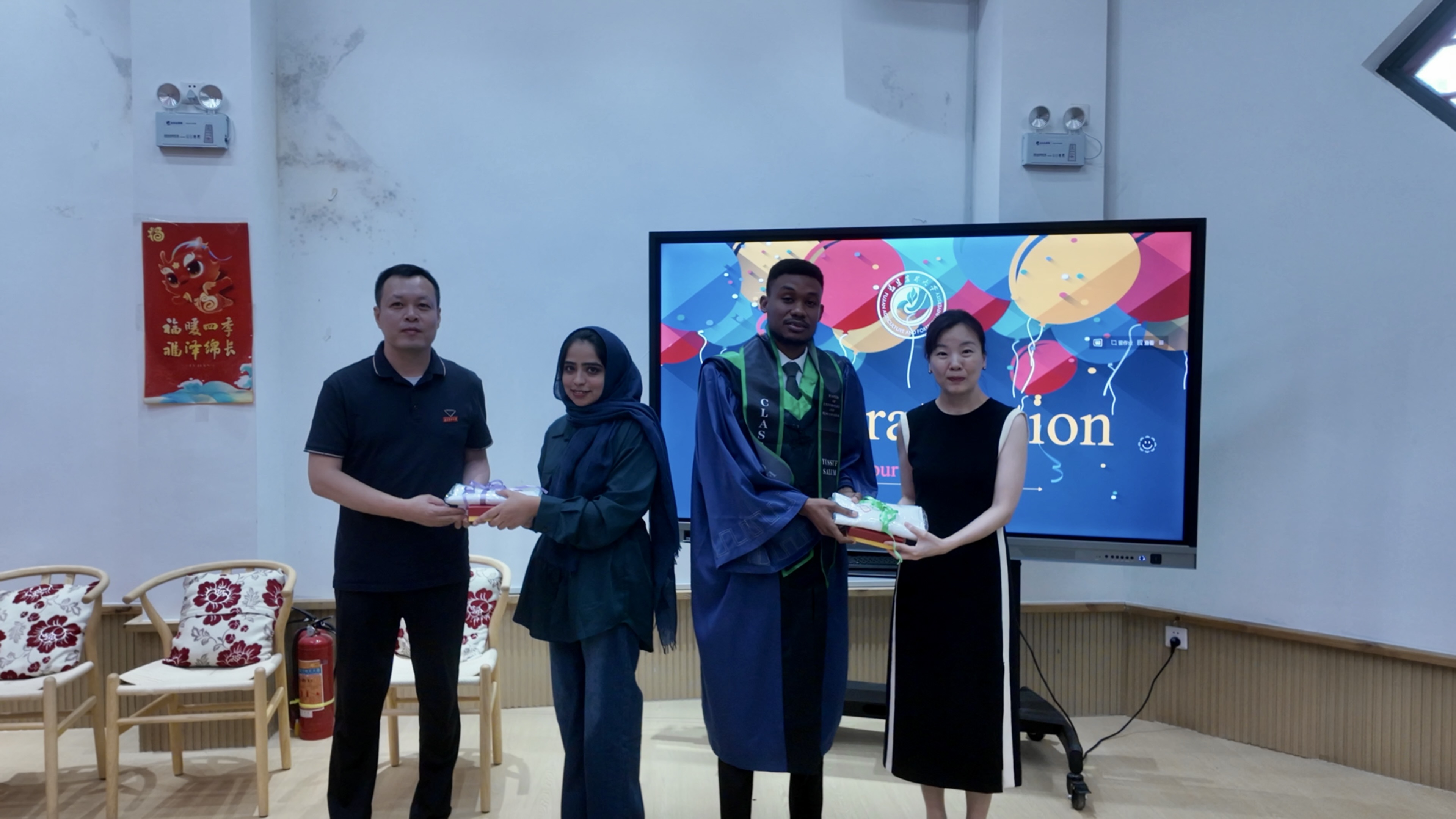 会上,吕健和刘丽敏共同为优秀毕业生代表、坦桑尼亚籍学生SALUM YUSSUF颁发嘉奖证书,表彰其学术与综合表现;同时向学生助手和志愿者颁发服务证书。缅甸籍毕业生MYAT HNIN WAI作为代表发言,分享“从忐忑到自信”的蜕变历程,感谢学院提供的成长平台。学院还为每位毕业生赠送定制纪念品,寄托对“全球校友”的深情祝福。