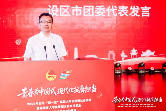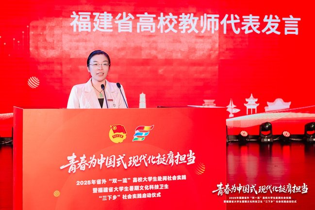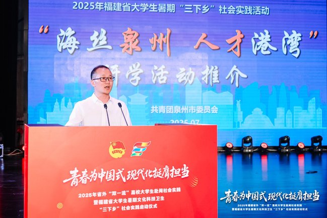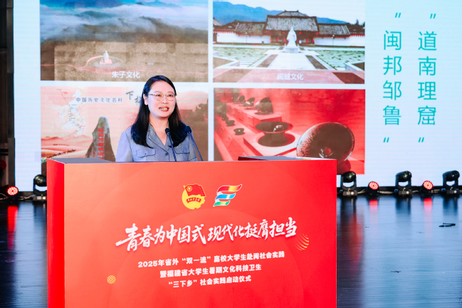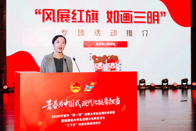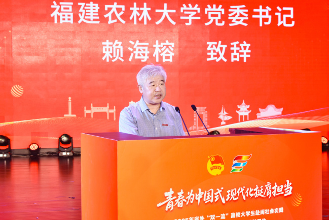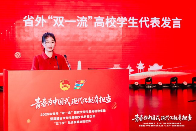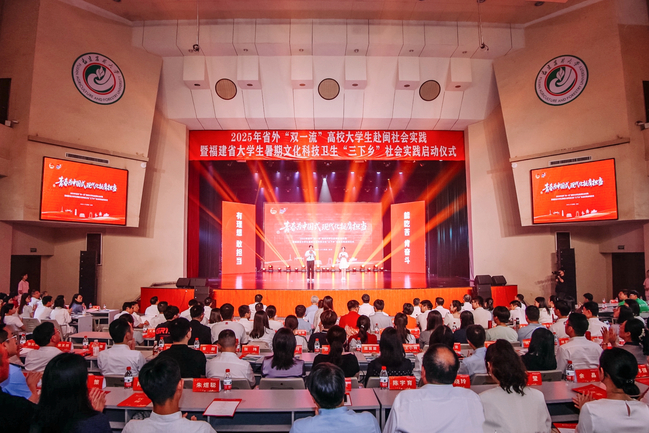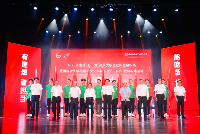 7月4日,由省委组织部等12家部门联合开展的2025年省外“双一流”高校大学生赴闽社会实践暨福建省大学生暑期文化科技卫生“三下乡”社会实践活动在我校金山校区大礼堂启动。校党委书记赖海榕代表学校致欢迎辞,团省委书记李腾出席活动。