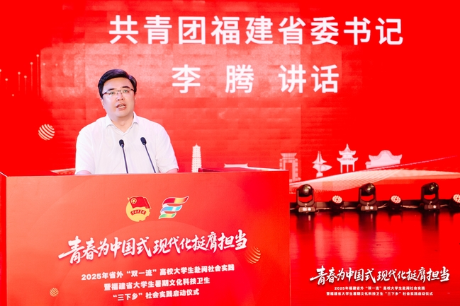李腾在讲话中表示,希望同学们用脚步丈量八闽版图,亲身感悟新征程的波澜壮阔,感知新福建的发展成就,感受新时代的山乡巨变,体悟习近平新时代中国特色社会主义思想的孕育和实践。发挥学科优势,带着专业资源、带着科创项目、带着解决方案到实践中去,在科技创新、文化教育、乡村振兴等领域建言献策、深化合作,共同分享福建发展的新机遇。福建共青团将牢牢把握为党育人根本任务,依托高校共青团“第二课堂成绩单制度” ,建好用好“三下乡”“返家乡”“社区实践”等育人机制,创新开展“青年实干家计划” ,不断挖掘实践深度,拓宽实践广度,为大学生更好体察国情、服务社会整合资源、搭建平台。