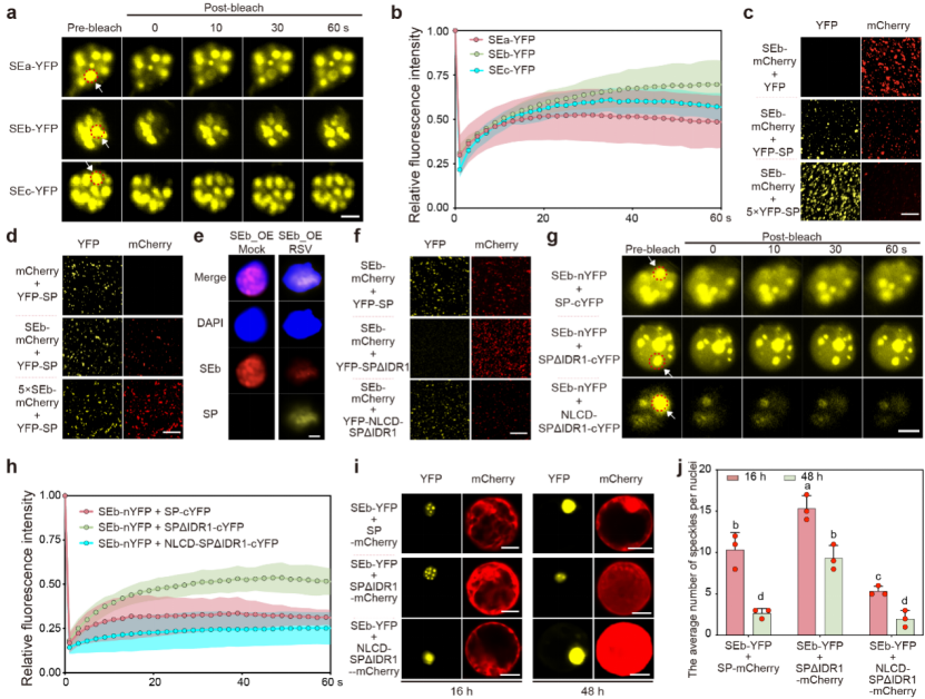 水稻条纹病毒(Rice stripe virus, RSV),是一种对我国乃至东亚稻区造成严重减产的虫媒病毒。课题组发现,RSV编码的病害特异蛋白SP,尽管自身无法在细胞中独立形成典型的生物大分子凝聚体,但却可通过其N端内在无序结构域(IDR1)展现相分离潜力,进而“劫持”并干扰宿主细胞核内的关键miRNA加工因子——SERRATE(SE)蛋白的相分离行为,破坏切割小体(Dicing body,D-body)的组装过程,从而显著抑制miRNA的生成。这一机制为植物病毒如何精准干扰宿主免疫系统提供了全新的生物物理学解释。