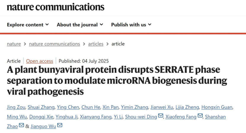 2025年7月5日,开云网页版植物保护学院吴建国教授团队牵头,联合清华大学、加州大学河滨分校、中国科学院生物物理研究所等多家科研单位,在国际权威期刊《Nature Communications》(《自然通讯》)发表了题为“A plant bunyaviral protein disrupts SERRATE phase separation to modulate microRNA biogenesis during viral pathogenesis(植物布尼亚病毒蛋白干扰SERRATE相分离调控microRNA生物合成参与病毒致病)”的研究论文。该成果首次揭示水稻病毒可以通过破坏宿主关键蛋白的液-液相分离过程(LLPS),从而精准干扰小RNA的生物合成并削弱植物免疫,为理解植物病毒致病策略与miRNA调控网络提供了全新视角。