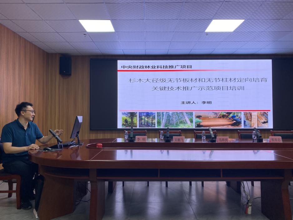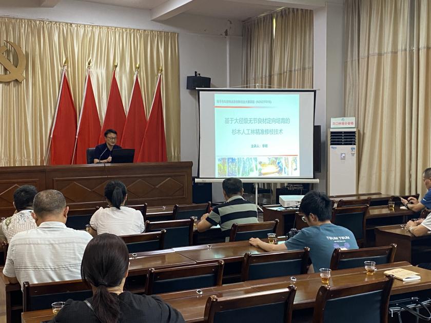 李明副教授结合其主持的南平市科技特派员项目《基于大径级无节良材定向培育的杉木人工林精准修枝技术》及中央财政推广项目《杉木大径级无节板材和无节柱材定向培育关键技术推广示范》,以《杉木大径级无节材培育的精准修枝技术》为主题,详细讲解了大径级无节材培育目标、修枝目的、修枝技术和修枝工具,并系统梳理了从无节板材到无节柱材的高值化经营技术体系。这些技术通过科技特派员制度直接对接生产需求,不仅提升了林农经营效益,更通过“问题导向”的科研模式推动学科在杉木高值化培育上形成特色优势,成为学院“双一流”建设中“服务需求、突出特色”的典型范例。