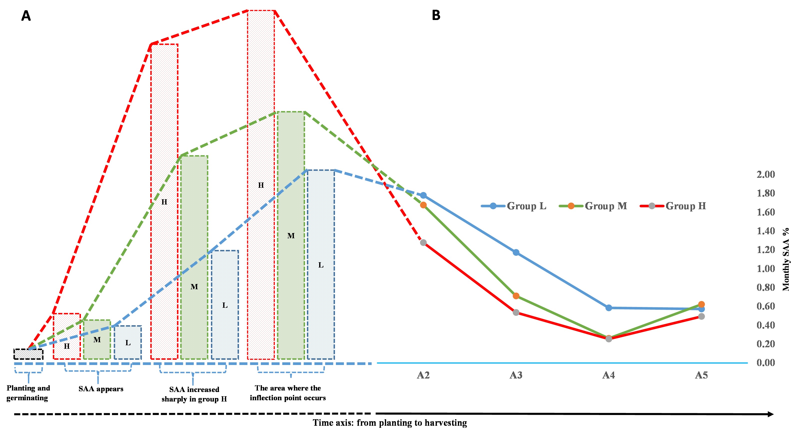本研究进一步发现A1与A6之间存在较强的遗传负向关系(r = - 0.66)(表1),这一关系还得到了2个环境(142个基因型、29次试验)11年的数据支持。A1 和 A6 之间相互联系的消长变化,可能为蔗糖分的遗传改良取得进一步突破设置了“天花板”。考虑到目前可用亲本的遗传背景,A1与A6之间的负相关关系似乎无法避免,但设法提高A1有益于高糖育种。基于A1与A6的关系,在全生育期尺度上,积累量曲线可能存在“拐点”(图1),针对“拐点”的研究可能是甘蔗高蔗糖育种取得进一步突破的关键。