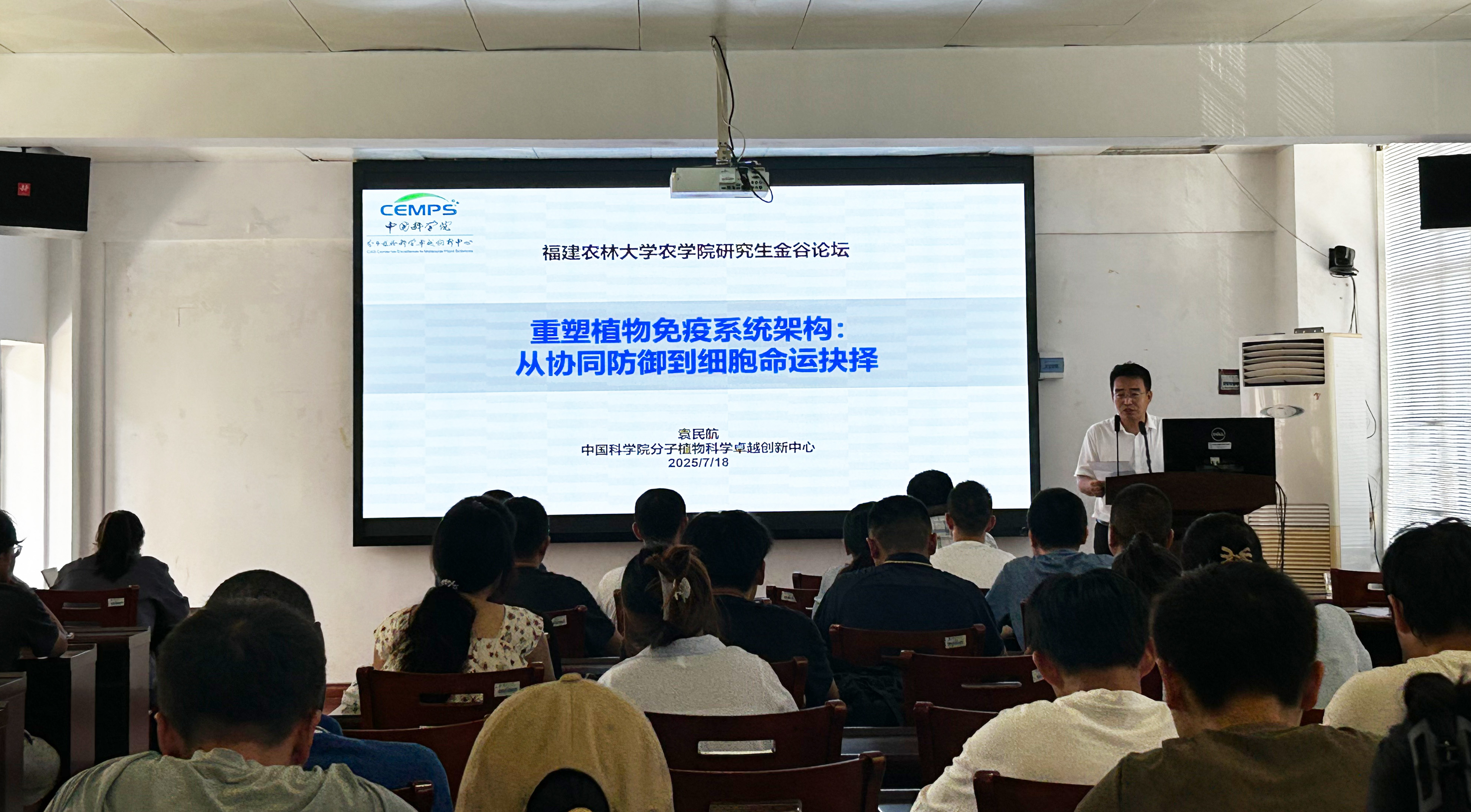 7月18日下午,由农学院主办的第二十六期研究生金谷论坛在学院302教室举行。本期论坛特邀中国科学院分子植物科学卓越创新中心博士后袁民航博士作题为《重塑植物免疫系统架构:从协同防御到细胞命运抉择》的学术报告。来自农学院、生命科学学院及兄弟院系的百余名师生到场聆听,论坛由学院副院长兰涛教授主持,现场座无虚席,讨论气氛热烈。