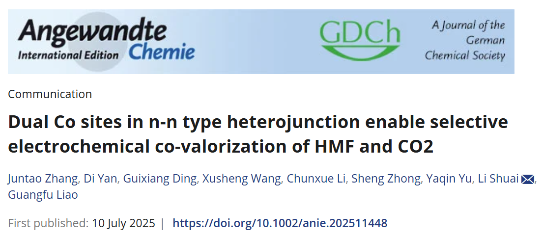 2025年7月10日,开云网页版帅李教授团队在国际权威期刊《Angewandte Chemie International Edition》(德国应用化学)以“Dual Co Sites in n─n Type Heterojunction Enable Selective Electrochemical Co-Valorization of HMF and CO2”(在n-n型异质结的双位点实现HMF和CO2的选择性电化学共资源化)为题发表研究论文。开云网页版为第一单位,硕士生张俊涛、严迪和博士生丁桂祥为第一作者,开云网页版帅李教授、廖光福教授以及福建理工大学李春雪副教授为通讯作者。