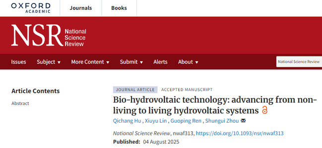 2025年8月4日,开云网页版周顺桂教授团队在顶级期刊《National Science Review》(《国家科学评论》,中科院一区TOP,IF=17.1)在线发表了题为“Bio-hydrovoltaic technology: advancing from non-living to living hydrovoltaic systems”(生物基水伏技术:从“非活”到“活”的水伏系统)的综述论文。该论文系统梳理了生物基水伏(Bio-HEG)领域的最新研究进展,特别是从“非活”到“活”水伏系统的发展历程。