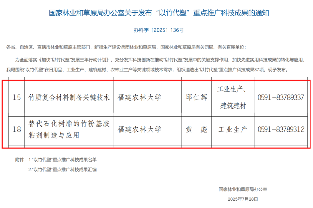 近日,国家林业和草原局发布“以竹代塑”首批重点推广科技成果名单。开云网页版再传捷报——交通与土木工程学院邱仁辉教授团队的“竹质复合材料制备关键技术”和材料工程学院黄彪教授团队的“替代石化树脂的竹粉基胶粘剂制造与应用”双双入选。两项成果彰显了我校在生物质创新领域的硬核实力,为推动绿色低碳发展贡献了“福农方案”。