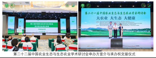 大会闭幕当天通过竞选方式决定 “第二十二届中国农业生态与生态农业学术研讨会”由安徽农业大学承办。我校菌草与生态学院党委书记陈月霄教授和安徽农业大学资源与环境学院院长张震教授进行了庄重的交接仪式,为本届研讨会画上圆满句号。