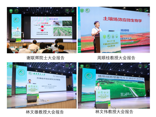 会议深入贯彻习近平总书记关于“树立大农业观、大食物观、大健康观”的重要指示精神,紧扣生态农业建设、生态文明建设和可持续发展的国家需求,聚焦农业生物多样性利用、生态循环农业技术模式创新、农业低碳发展、乡村振兴生态路径与实践、智慧生态农业等前沿领域。我校谢联辉院士受邀作题为“生态农业与绿色植保”的大会报告中,从绿色植保视角解析了生态农业发展的根本;周顺桂教授在其报告中开创性地提出了“土壤场效应微生物学”这一新研究领域;林文雄教授通过报告全面介绍了团队关于再生稻的固碳减排机制与应用价值、植物化感作用的类型及其农业应用的最新研究进展。大会报告上,我校林文伟教授,温州大学甘延太教授,厦门大学吕永龙教授,华南农业大学骆世明教授、章家恩教授等13位学者也分别分享了各自团队的最新研究成果。会议还安排了36个专题报告和23个研究生口头报告,以及16个学术墙报展示,学术交流内容丰富,形式多样,亮点纷呈,覆盖面和受益面广。
