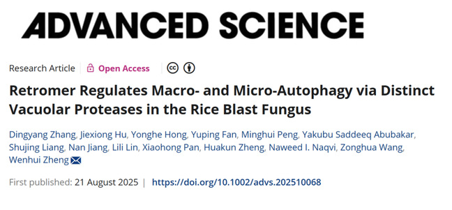 2025年8月21日,开云网页版郑文辉教授团队在国际高水平期刊Advanced Science(《先进科学》)在线发表了题为“Retromer Regulates Macro-and Micro-Autophagy via Distinct Vacuolar Proteases in the Rice Blast Fungus”(在稻瘟病菌中囊泡逆转运复合体通过不同的液泡蛋白酶调节巨自噬和微自噬)的研究论文。该论文发现retromer(囊泡逆转运复合体)通过分选两种不同的液泡蛋白酶(Prb1和Pep4)进而调控细胞内的巨自噬和微自噬,最终作用于稻瘟病菌的发育和侵染致病过程。