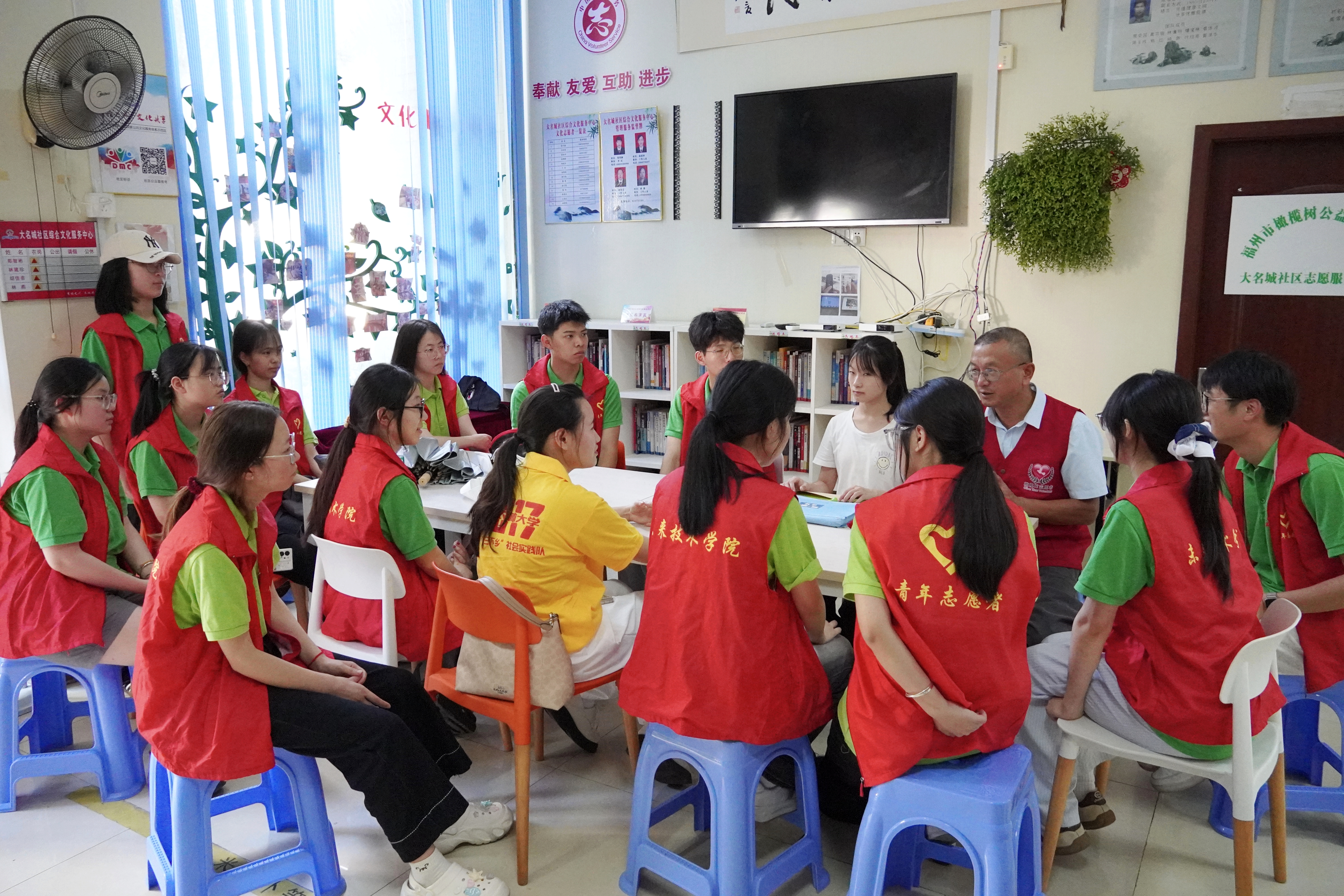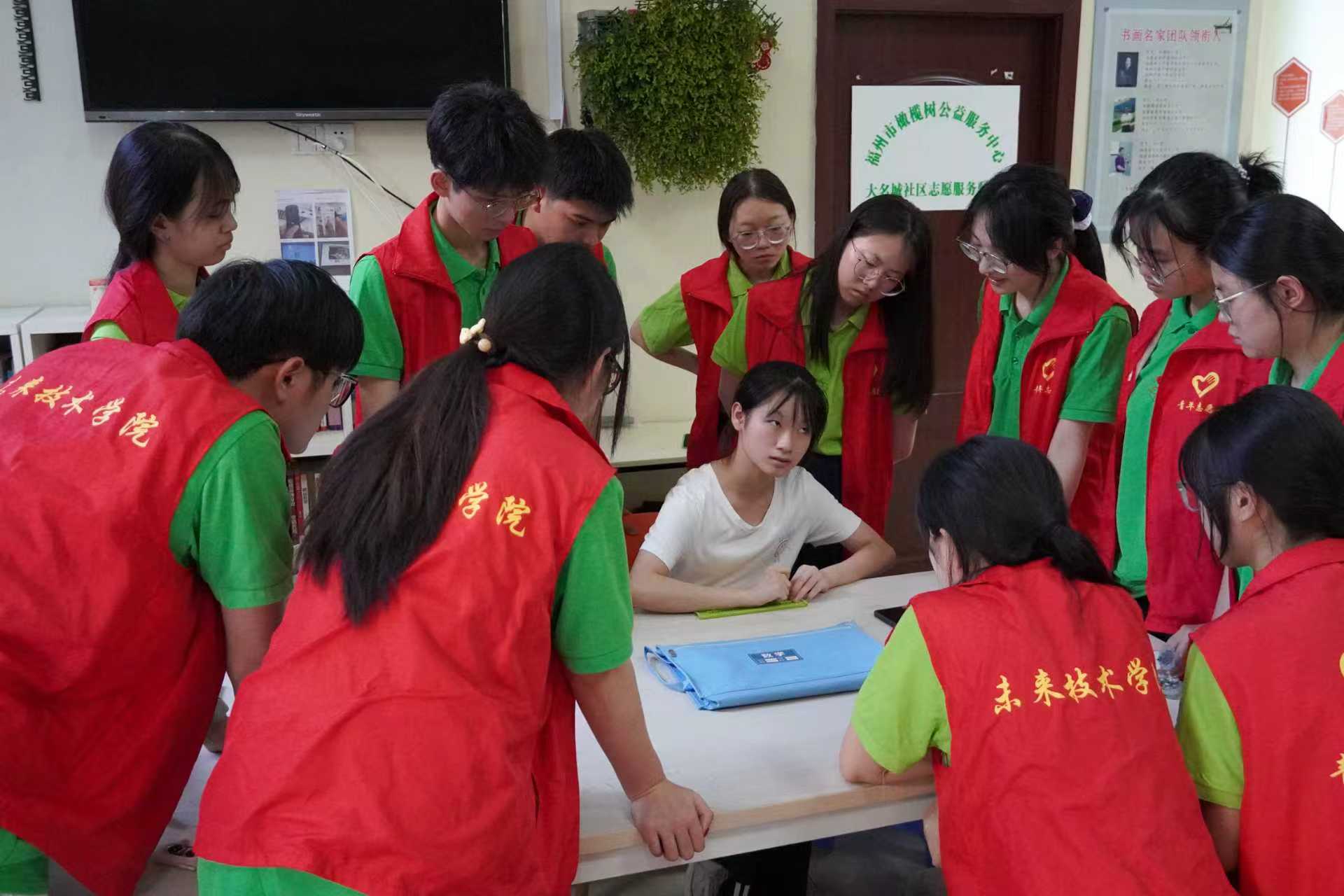 7月3日,实践队走进大名城社区志愿服务驿站,与福州市橄榄树公益中心负责人开展座谈会,围绕助盲志愿服务问题及未来发展方向深入探讨。通过交流,队员们拓宽视野,对助盲志愿服务有了更全面深入的理解。座谈会后,队员们跟随盲校女孩学习盲文写法,深刻认识视障人士在学习过程中面临的巨大挑战,更加坚定了为助盲事业贡献力量的决心。