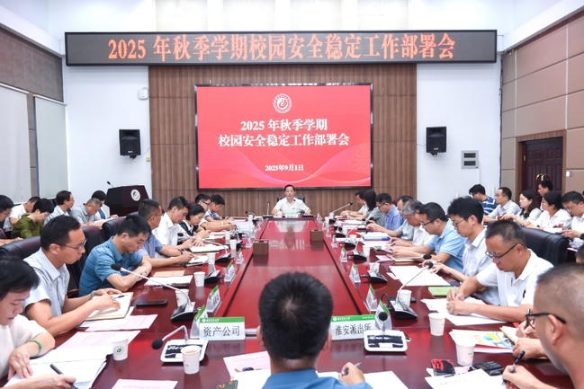 9月1日下午,我校在明德楼武夷厅组织召开2025年秋季新学期校园安全稳定工作部署会,校党委副书记曾华平出席会议并讲话。党政办、组织部、宣传部、统战部、教工部、学工部、武装部、离退休办、教务处、研究生院、科技处、对外处、计财处、国资处、后勤处、基建处、校园办、校团委、信息中心、资产公司、校医院、淮安派出所等相关部门负责人,各学院党委副书记参加会议。