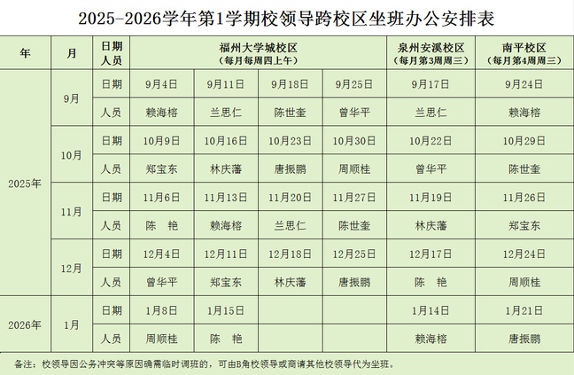 接下来,全体校领导都将定期、轮流前往福州仓山主校区外的其他校区坐班办公,其中福州大学城校区每月每周四、泉州安溪校区每月第3周周三、南平校区每月第4周周三,各安排一位校领导坐班办公。