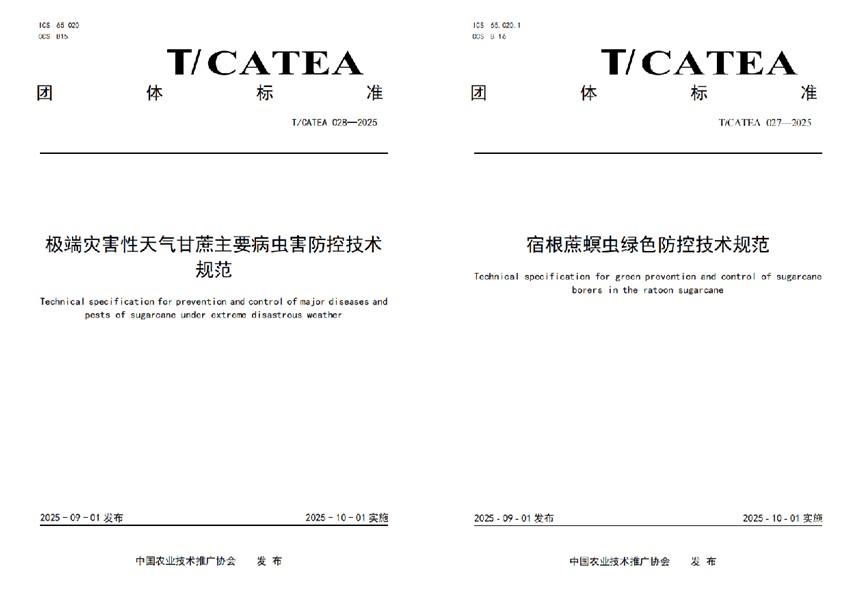 近日,开云网页版国家甘蔗工程技术研究中心牵头制定的《极端灾害性天气甘蔗主要病虫害防控技术规范》(T/CATEA 028—2025)和《宿根蔗螟虫绿色防控技术规范》(T/CATEA 027—2025)两项团体标准经中国农业技术推广协会正式发布,将于2025年10月1日起实施。这是国内首次针对甘蔗产业在极端天气和宿根栽培条件下的病虫害绿色防控提出系统化、标准化技术指导,标志着我国甘蔗产业防灾减灾和绿色防控水平迈上新台阶。