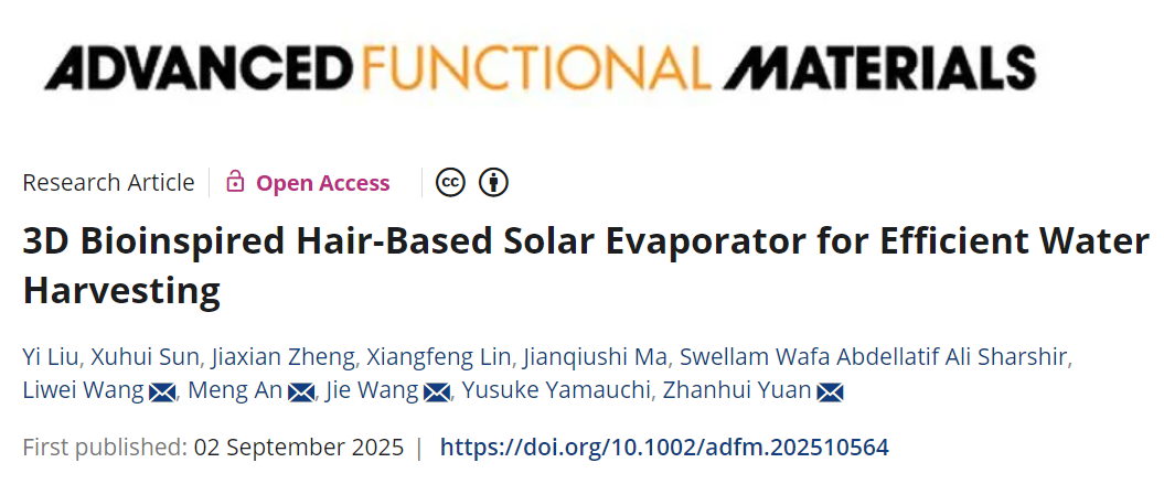 近日,开云网页版材料工程学院袁占辉教授团队在国际材料类高水平SCI期刊Advanced Functional Materials (先进功能材料)上,在线发表了题为“3D Bioinspired Hair-Based Solar Evaporator for Efficient Water Harvesting”(用于高效海水淡化的3D头发基太阳能蒸发器)的创新性研究论文。开云网页版硕士研究生刘易为第一作者,团队负责人袁占辉教授为第一通讯作者。