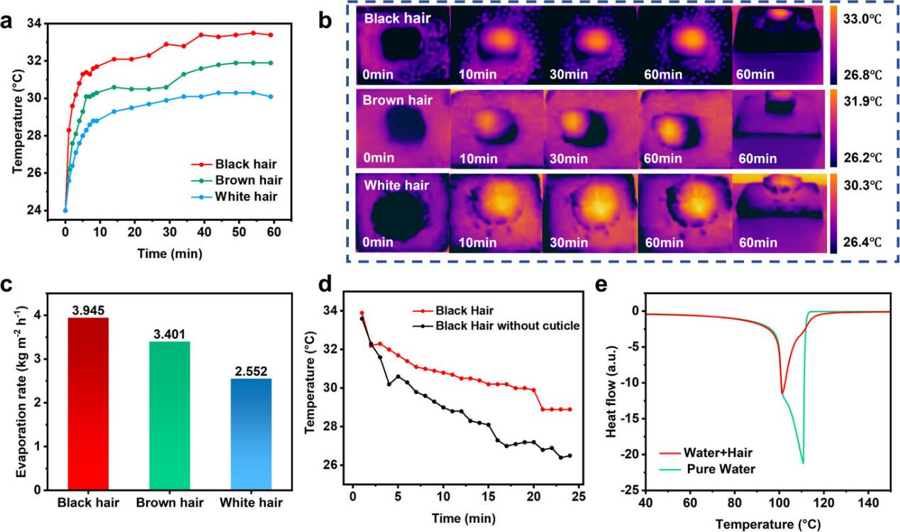 图3.(a) 基于黑发、棕发和白发的蒸发器在1倍太阳光强照射下的温度变化曲线。(b) 黑发、棕发和白发蒸发器照射后的红外热成像图。(c) 15 wt.%盐水中,在1.0 kW m⁻²光强照射下,黑发、棕发和白发蒸发器的蒸发速率对比(黑发蒸发器的蒸发速率取自图4a中第7小时的蒸发速率)。(d) 完整黑发与去鳞片(无毛鳞片结构)毛发的隔热性能对比。(e) 差示扫描量热法(DSC)分析对比毛发中水与纯水的蒸发焓,突显该头发基系统的节能效应。