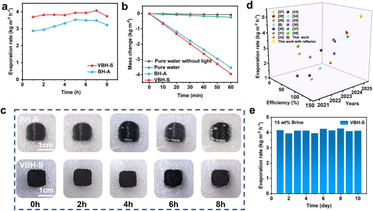 图4.(a) VBH-S蒸发器和BH-A蒸发器在15 wt.%盐水中,1.0 kW m⁻²光强照射下的蒸发速率变化。(b) VBH-S蒸发器、BH-A蒸发器以及纯水在有无光照条件下的水质量变化对比。(c) BH-A蒸发器和VBH-S蒸发器在长时间运行后的表面形貌对比。(d) 本工作VBH-S蒸发器与已报道的多种蒸发器系统的蒸发速率对比。(e)VBH-S 蒸发器在15 wt.% 盐水中超过10天的长期运行稳定性。