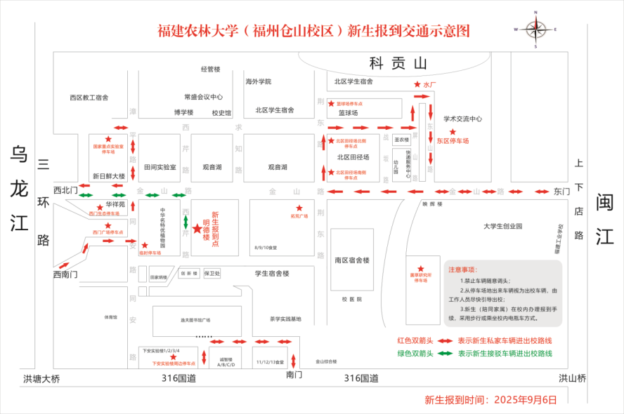 为做好2025级新生入学报到工作,报到日当天(9月6日)我校福州仓山校区实行临时交通管控,所有进校车辆须服从学校交通指挥,接送新生报到车辆进出校园按下图线路行驶,敬请支持配合。9月6日零点起,所有进校车辆免收停车费,9月7日零点起车辆收费系统恢复运行。