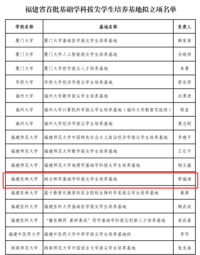 9月3日,福建省教育厅公示了福建省首批基础学科拔尖学生培养基地拟立项名单,林学院申报的“闽台林学基础学科拔尖学生培养基地”成功入选。这是学校林学学科建设与人才培养工作的重要突破,标志着其在高层次林业人才培养体系建设方面迈上了新台阶。