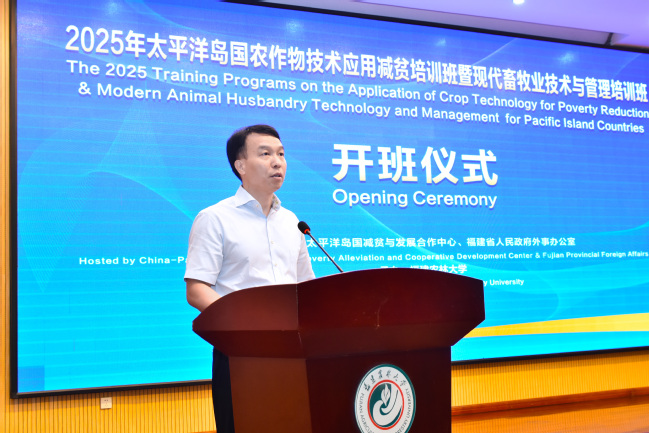 9月11日上午, 2025年太平洋岛国农作物技术应用减贫培训班暨现代畜牧业技术与管理培训班开班仪式在开云网页版福州仓山校区常盛会议中心举行。福建省人民政府外事办公室党组成员、副主任陈国全,校党委书记赖海榕出席开班仪式并致辞。开班仪式由副校长唐振鹏主持。来自斐济、汤加、巴布亚新几内亚、所罗门群岛、瓦努阿图等五国的29名学员参加培训。