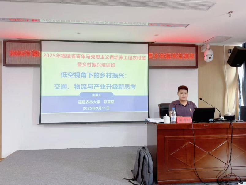 9月11日下午,我校交通与土木工程学院青年教师祁首铭应邀在福建省团校为2025年福建省青年马克思主义者培养工程农村班暨乡村振兴培训班学员进行题为“低空视角下的乡村振兴:交通、物流与产业升级新思考”的专题授课,系统讲解了低空经济政策、内涵、发展现状等低空经济相关知识,并结合实际案例分析了其在交通、物流和农林领域的应用,并提出了低空背景下乡村振兴的思考。