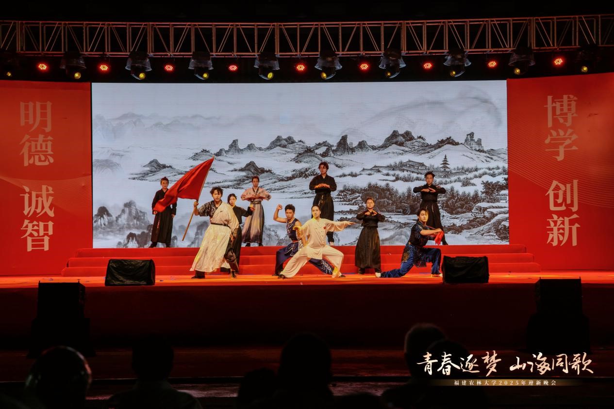 由材料工程学院艺术团、校大学生武术协会带来的武术表演《九州同》,武术与民族舞刚柔并济,一招一式尽显中华气魄,寓意中华民族虽地域辽阔、文化多元,却始终同心同德、血脉相连,充分体现了一代代福农学子植根中华沃土,传承民族精神,立志民族复兴的坚定信念与时代担当。
