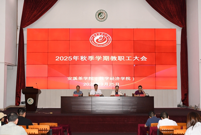 9月25日下午,安溪茶学院(数字经济学院)在诚智报告厅召开2025年秋季学期教职工大会,全面部署新学期各项工作。学院全体教职工参加了会议。会议由院长郭玉琼主持。