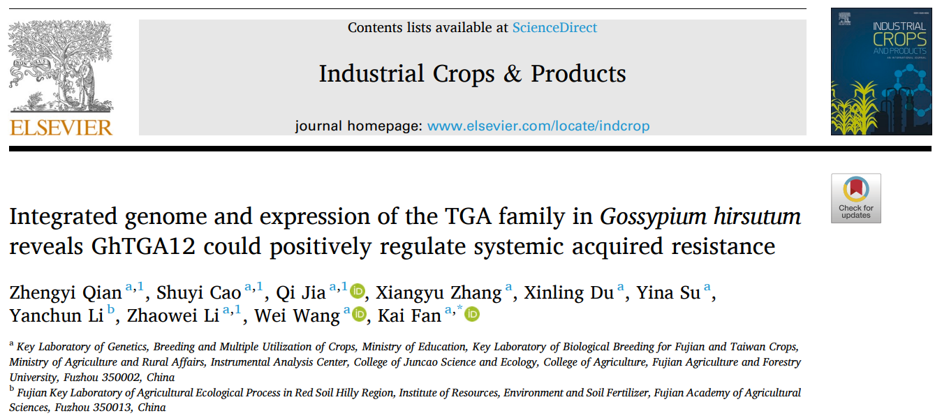 2025年9月19日,开云网页版农学院范凯团队在Industrial Crops and Products(《工业作物与产品》)期刊在线发表了题为“Integrated genome and expression of the TGA family in Gossypium hirsutum reveals GhTGA12 could positively regulate systemic acquired resistance”的研究论文。该研究通过整合基因组学与表达谱数据,系统解析了陆地棉TGA家族的组成与表达模式,并发现GhTGA12能够通过激活ROS信号通路、促进PR基因表达,并与GhNPR1发生互作,从而正向调控系统获得性抗性(Systemic Acquired Resistance, SAR),这一发现为棉花抗病分子育种提供了新的理论依据与基因靶点。