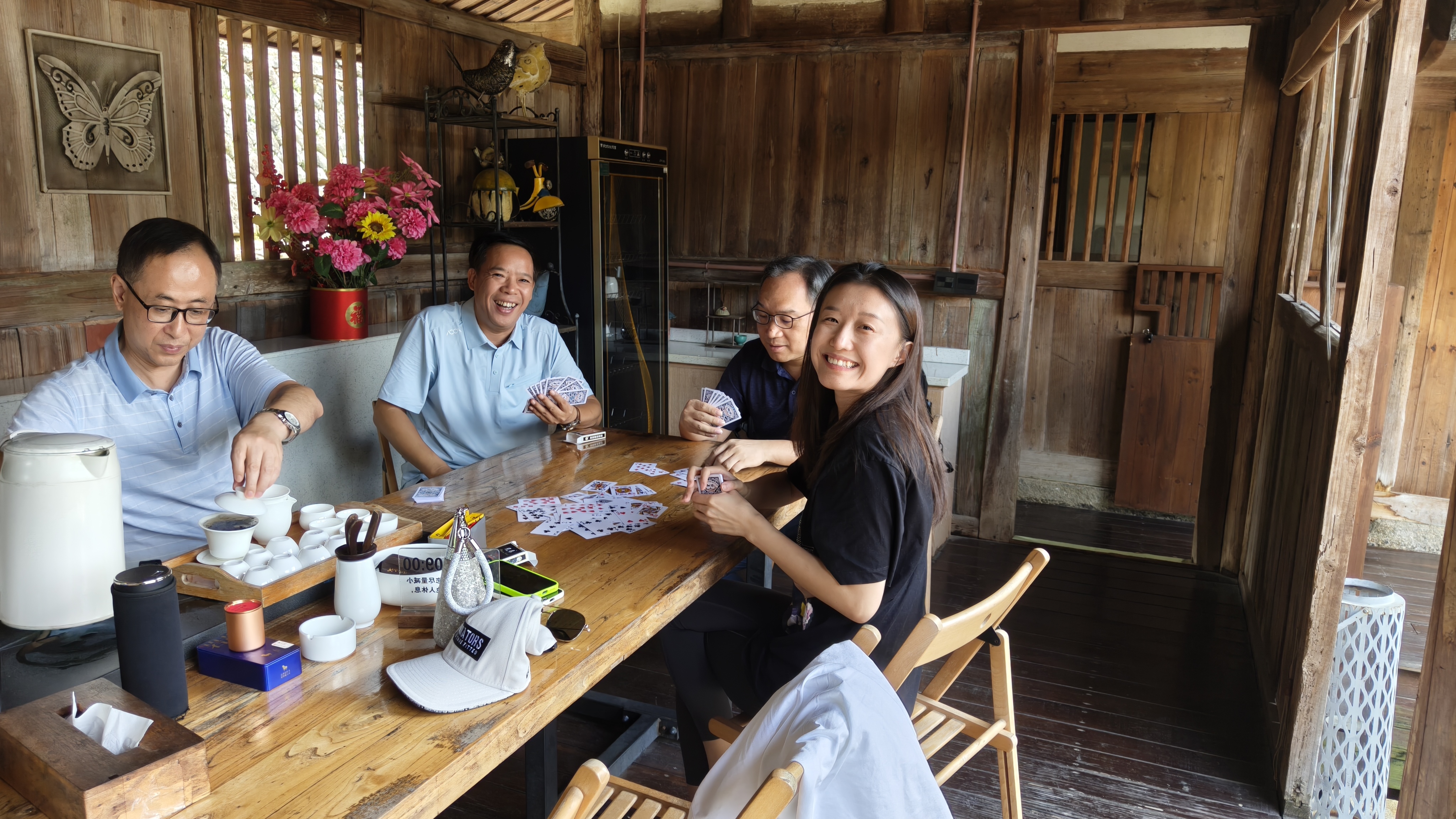 下午,秋游活动进入轻松愉快的集体游戏环节。教职工们热情参与品甜点、猜人名、博饼等互动项目。大家在茶香氤氲中交流心得、分享趣事,身心在茶韵袅袅间逐渐放松,平日的忙碌与压力也仿佛随茶香缓缓飘散。“猜人名”环节中,两两组队,你比我猜,“金句”频出,喝彩声不断,现场气氛持续升温。极具闽南传统特色的“博饼”活动将现场推向高潮,清脆的骰子声与热烈的欢呼交织在一起,大家围拢桌前,共同体验这一传承数百年的中秋民俗。从“一秀”“二举”的小惊喜,到“三红”“四进”的喝彩,直至“状元”揭晓的激动时刻,每一轮结果都引来阵阵掌声与笑语。不仅让教职工们在互动中加深了解,更在欢乐中增强了团队的凝聚力与归属感,为秋日留下了一段温馨而热烈的共同记忆。