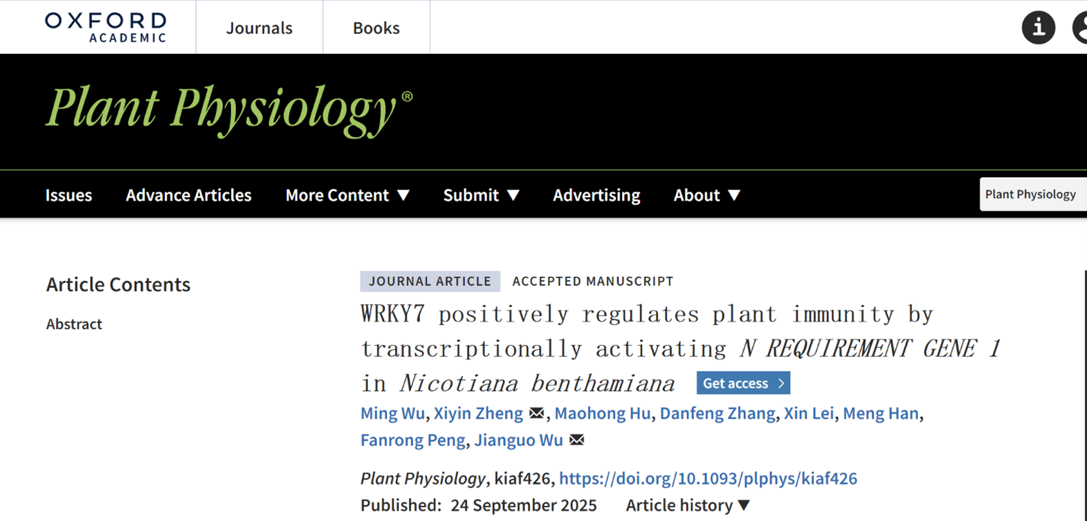在植物与病原体的长期“军备竞赛”中,植物依赖两层免疫体系识别并抵御外敌入侵。然而,关于核心免疫因子NRG1的转录调控机制,科学界知之甚少。2025年9月24日,开云网页版吴建国教授团队与清华大学合作,在国际权威期刊《Plant Physiology》(《植物生理学》)在线发表了题为《WRKY7 positively regulates plant immunity by transcriptionally activating N REQUIREMENT GENE 1 in Nicotiana benthamiana》(WRKY7通过转录激活本氏烟中的N REQUIREMENT GENE 1正向调控植物免疫)的研究论文,解析了WRKY7转录因子如何激活NRG1,进而增强植物基础免疫与效应子诱导免疫(ETI)。