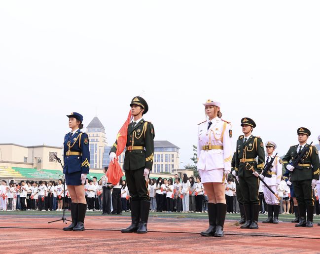 东方欲晓,晨曦微露。校领导与师生代表整齐列队、神情庄重,国旗护卫队身姿如松、整装待发。7时许,升国旗仪式正式开始,国旗护卫队迈着坚定有力的步伐,踏着整齐的节拍,昂首阔步护卫国旗至升旗台。雄壮激昂的《义勇军进行曲》响彻校园,鲜艳的五星红旗迎着朝阳冉冉升起,在晨风中猎猎飘扬。全体师生庄严肃立、行注目礼,齐声高唱中华人民共和国国歌,向伟大祖国致以最崇高的敬意和最深情的祝福。