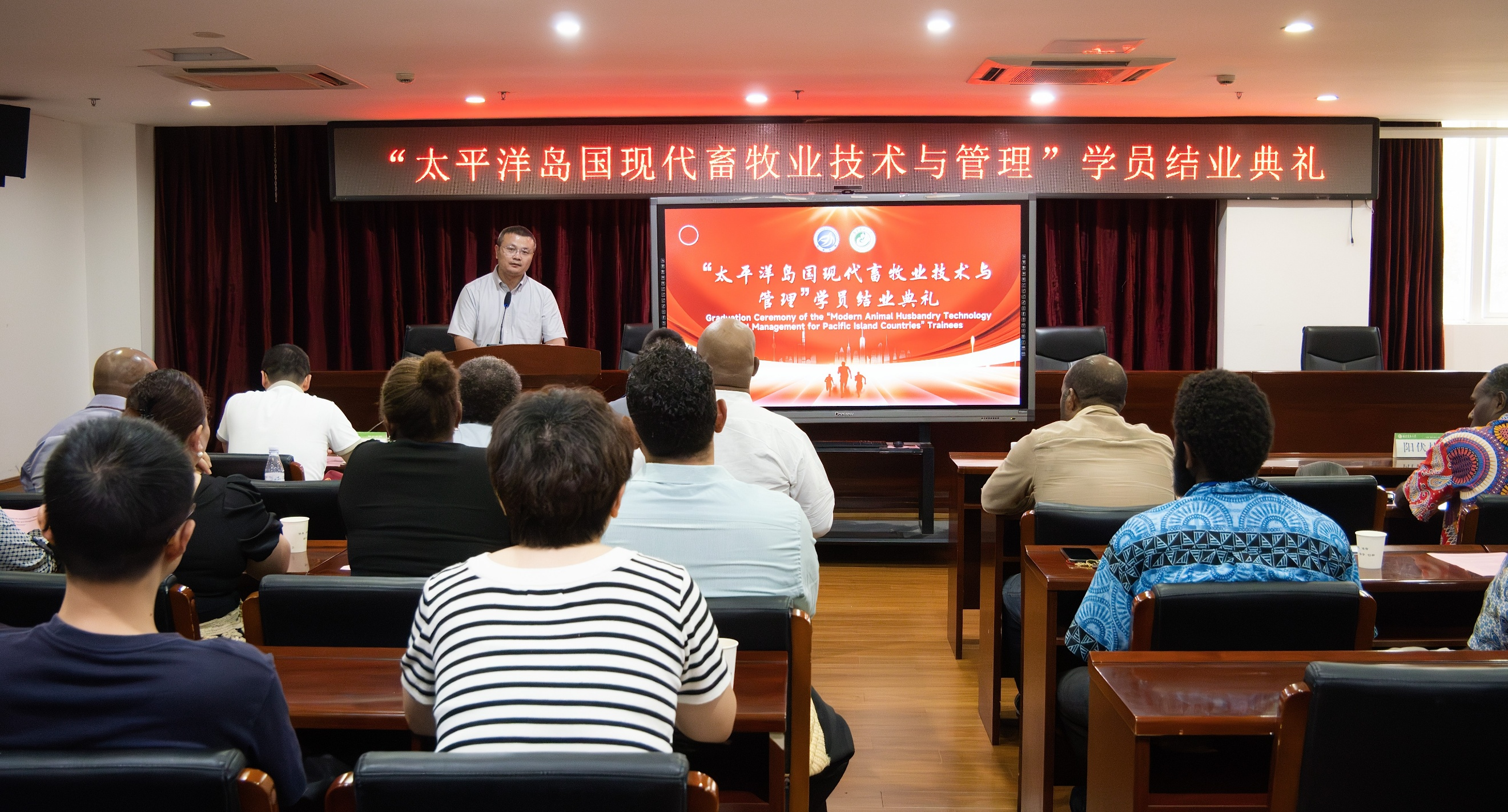 郭桂杰代表动物科学学院致辞,向顺利完成为培训的学员们表示热烈祝贺,并衷心感谢福建省人民政府外事办公室和中国—太平洋岛国减贫与发展合作中心的支持与指导。郭桂杰表示,此次培训不仅提升了学员们的现代畜牧业技术与管理能力,更加强了各方交流与合作的基础。希望学员们将所学知识结合本国实际,推动畜牧业现代化,促进区域农业可持续发展。