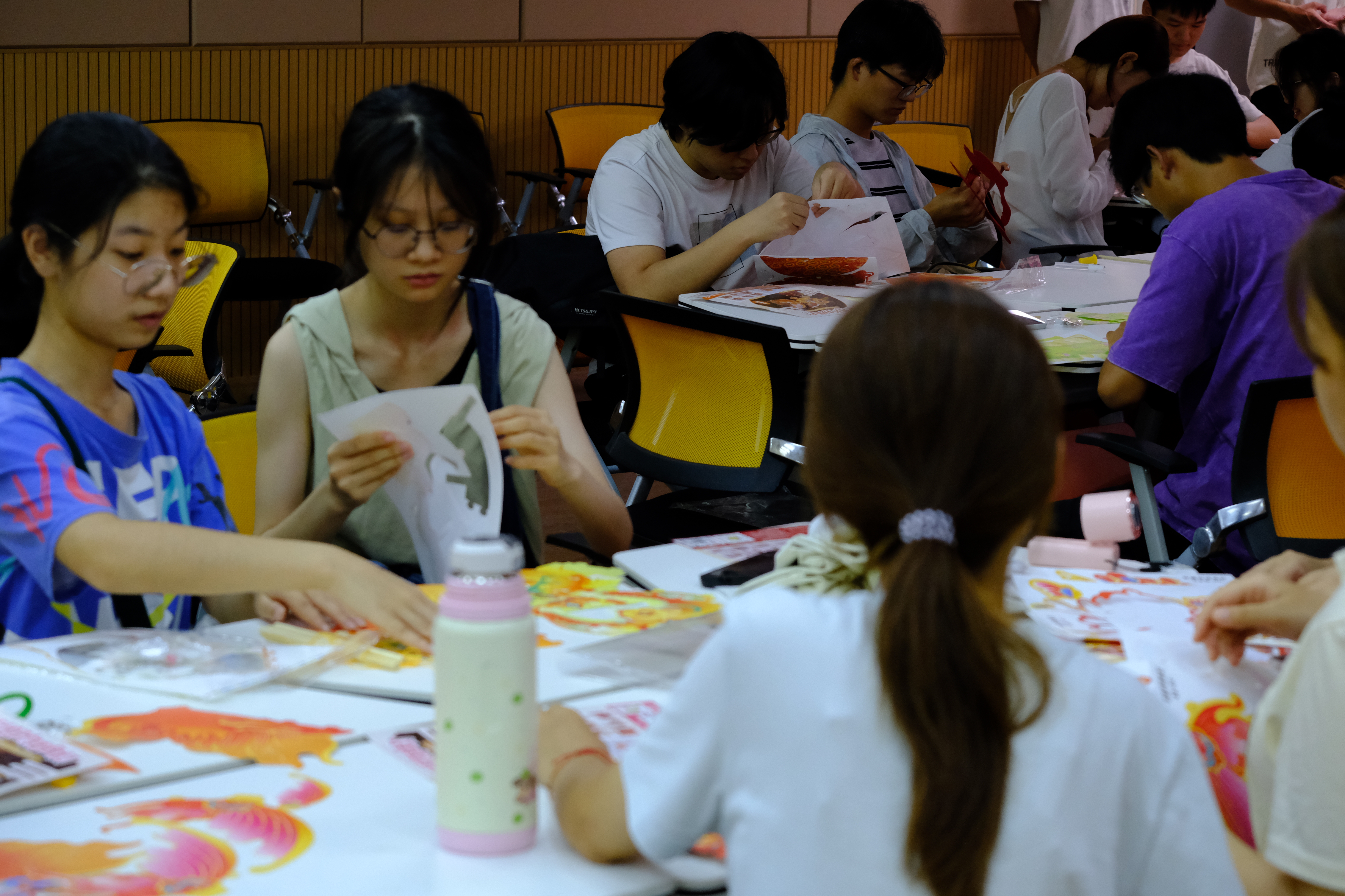 理论知识的铺垫迅速转化为实践的热情,花灯DIY环节正式开始,活动现场变成了一个充满欢声笑语的工坊。结合专业特色,本次花灯DIY的材料包选取了锦鲤灯、龙虾灯、螃蟹灯、水母灯等具有海洋元素特色的水族花灯。工作人员展示了不同花灯的制作教程。同学们在领到材料包后,纷纷发挥创意,各显神通。裁剪、拼接,还有补充的题字、绘画,让花灯成为参与者的“限定专属款”。巧手翻飞间,一盏盏“海派”花灯初具雏形。灯光映照着一张张专注而愉悦的脸庞,大家一边动手制作,一边交流互鉴,现场气氛热烈,其乐融融。