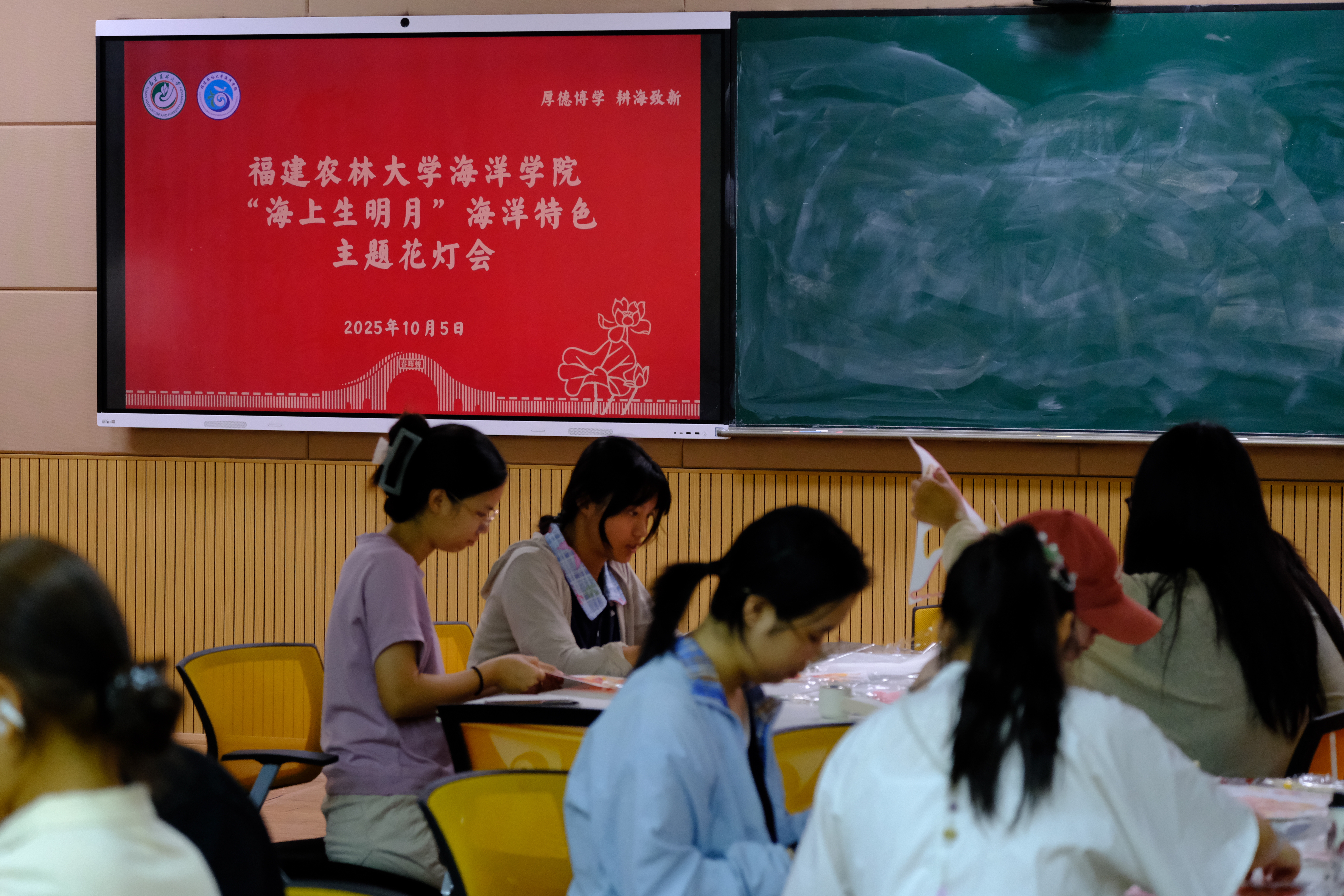 为弘扬中华优秀传统文化,推动专业特色与美育实践深度融合,10月5日,海洋学院在禧强楼304智慧教室举办“‘海’上生明月”主题中秋灯会。现场35名同学执灯弄巧、共话团圆,在剪裁拼贴、描画点染间,触摸非遗温度,厚植文化情怀。
