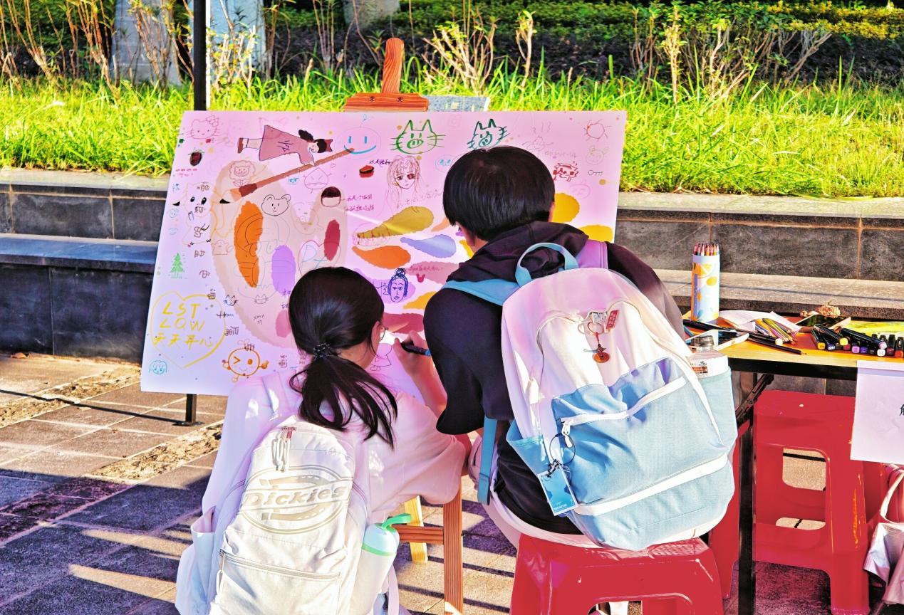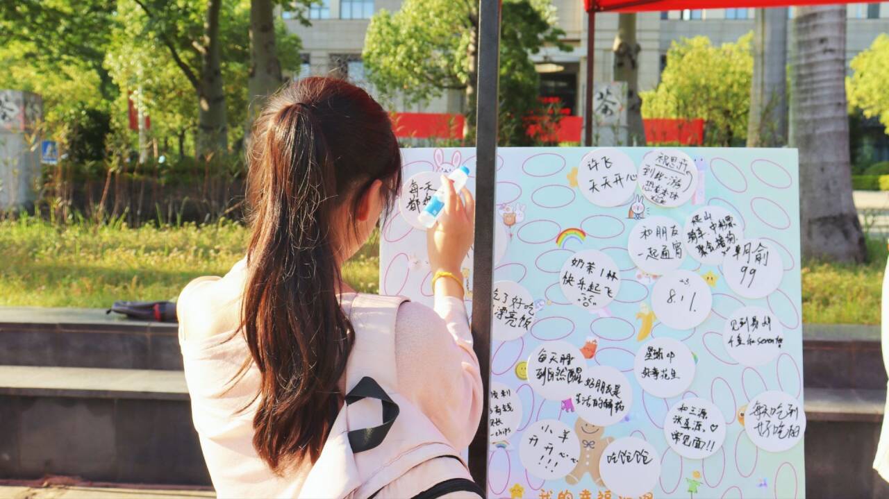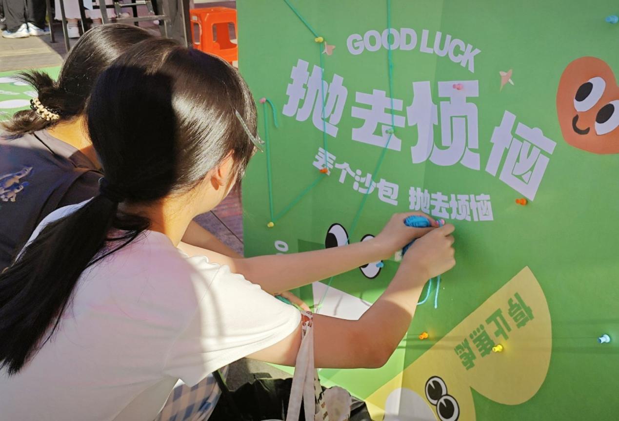 活动还精心设计了多项互动游戏环节,引导同学们在参与中疏解情绪、释放压力。在“抛开蕉绿”环节,参与成员借助投掷物品命中目标,以此宣泄内心的焦虑情绪;“玩个毛线”环节,同学们充分调动思维,将能带给自己幸福感的活动因子用彩色毛线一一连接,交织成一张张“幸福网”;“解忧调色盘”的环节中,参与者将近期的压力和调节方法感知成色彩,画在圆形画纸上,贴在“情绪画廊”展示区,让无形的情绪有了可触摸的“出口”;“我的幸福泡泡”环节里,现场同学写下幸福小事粘贴在互动墙上,用生活点滴温暖这一方天地;走至“釜底抽薪”的活动摆点前,活动成员大声念出积木上的情绪词和心理小贴士,分享自己的情绪调节妙招,在游戏中了解心理知识。