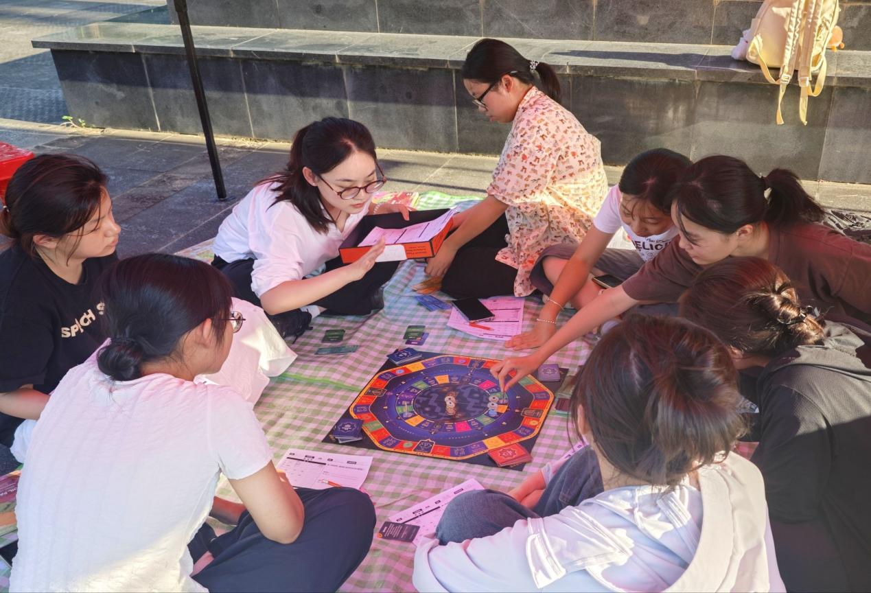 游戏“井字棋”融合益智与心理科普,通过两两对战的形式在竞技中传递积极心理理念;在“故事换花”环节中,到场同学通过分享自己的心理成长故事换取鲜花,让善意随着芬芳传递;游戏“心理大富翁”活动点前人流络绎不绝,每4名同学通过轮流投骰子,完成对应格子的指定任务并走到终点来决出胜负,在欢笑声中增进彼此情谊;朋辈心理辅导员队伍组织的“财富流体验区”让大家模拟不同年龄段的人群,在角色扮演中逐步提升面对现实问题的决策能力。