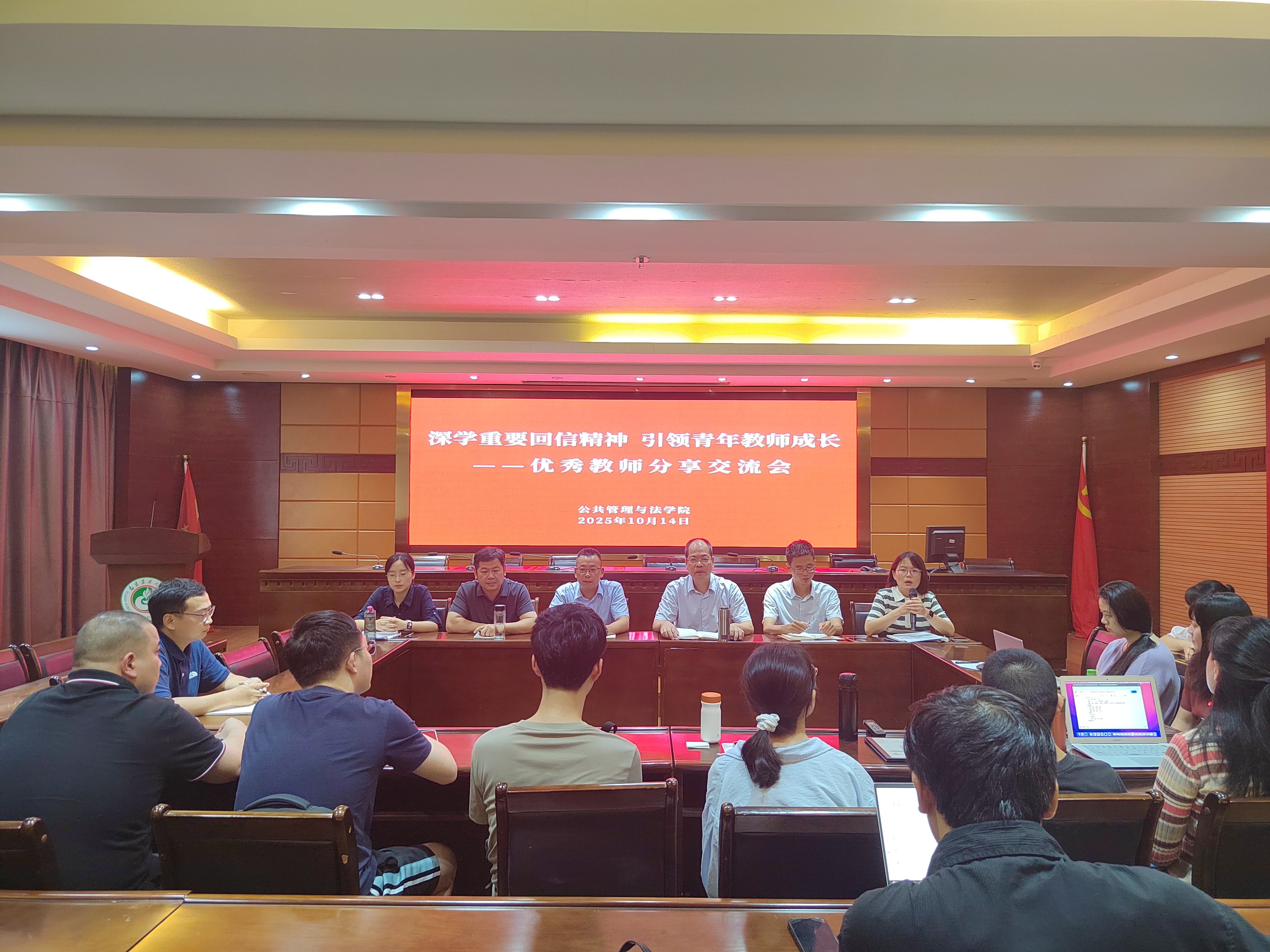 为进一步深入学习贯彻习近平总书记重要回信精神,发挥学院先进教师典型在践行重要回信精神中的示范引领作用,用鲜活事例带动学习宣传教育,激发青年教师干事创业的热情。10月14日,公共管理与法学院在学院三楼报告厅举办“学习重要回信精神 引领青年教师成长”优秀教师分享交流会。会议邀请学院六位优秀教师代表结合各自学习贯彻习近平总书记重要回信精神体会,围绕教学科研、人才培养、社会服务等主题进行经验分享,学院全体青年教师参加交流。会议由院党委书记蓝天水主持。