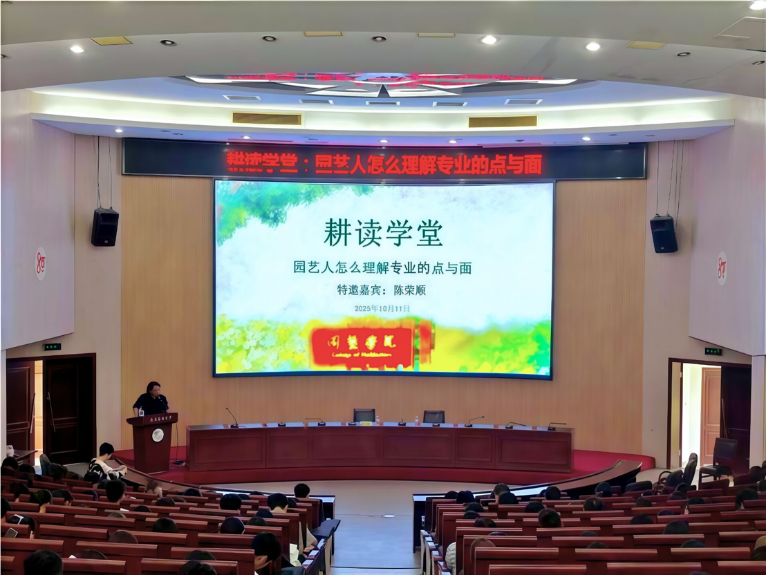 10月11日下午,园艺学院在博学报告厅举办第五期“耕读学堂”活动。本次活动以“园艺人怎么理解专业的点与面”为主题,特邀2002届优秀校友、园林绿化高级工程师、插花花艺领域国家级高级技师(一级)陈荣顺主讲,学院党委副书记康恩慧,全体辅导员及340名本科生共同参加,活动由李纷芬老师主持。