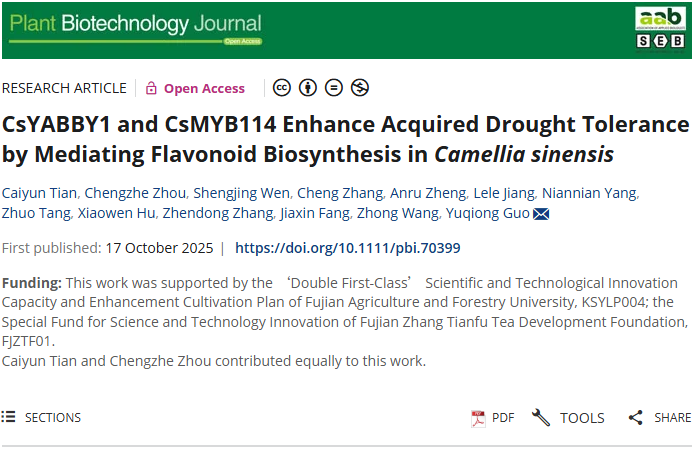 10月17日,我校郭玉琼教授团队在国际高水平期刊Plant Biotechnology Journal(《植物生物技术》)在线发表了题为“CsYABBY1 and CsMYB114 enhance acquired drought tolerance by mediating flavonoid biosynthesis in Camellia sinensis”(CsYABBY1和CsMYB114通过调控类黄酮生物合成增强茶树获得性耐旱)的研究论文,揭示了CsYABBY1和CsMYB114转录因子在茶树获得性耐旱形成中的重要作用。