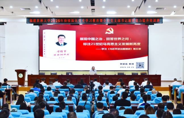 培训班首场报告邀请到福建江夏学院马克思主义学院首任院长、中国亚洲太平洋学会理事郭健彪教授作《展现中国之治,回答世界之问:标注21世纪马克思主义发展新高度——学习〈习近平谈治国理政〉第五卷》专题辅导报告。郭教授围绕《习近平谈治国理政》第五卷的发行背景、整体框架和世界意义,从严峻复杂的国际环境和艰巨繁重的国内改革发展稳定任务、推动新时代中国特色社会主义丰富与发展、中国自身发展促进世界共同繁荣三个方面,全面系统解读《习近平谈治国理政》第五卷的理论逻辑和实践要求。报告主题鲜明、逻辑严密、内涵丰富,对我校全体党员、干部学好用好《习近平谈治国理政》第五卷,深刻领悟习近平新时代中国特色社会主义思想的真理力量和实践伟力,具有很好的指导作用。