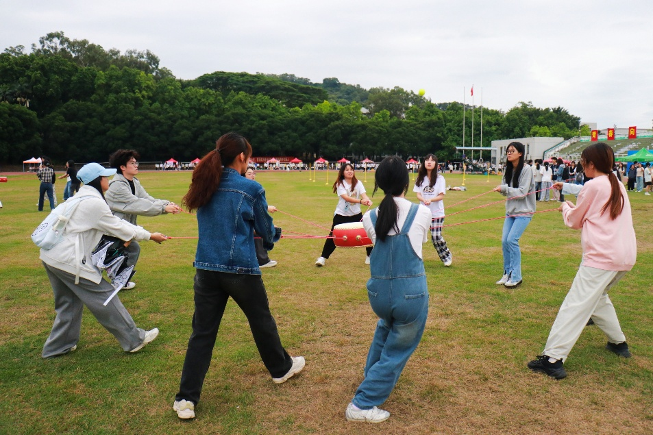 趣味项目区,11个班级的代表队在“同心鼓”项目中默契配合,注视着网球在鼓面上规律跃动;32支宿舍队伍在“旋风跑”中灵活绕杆,舍友们协同前进,在轻松愉快的氛围中深化了集体情谊,现场欢声不断。