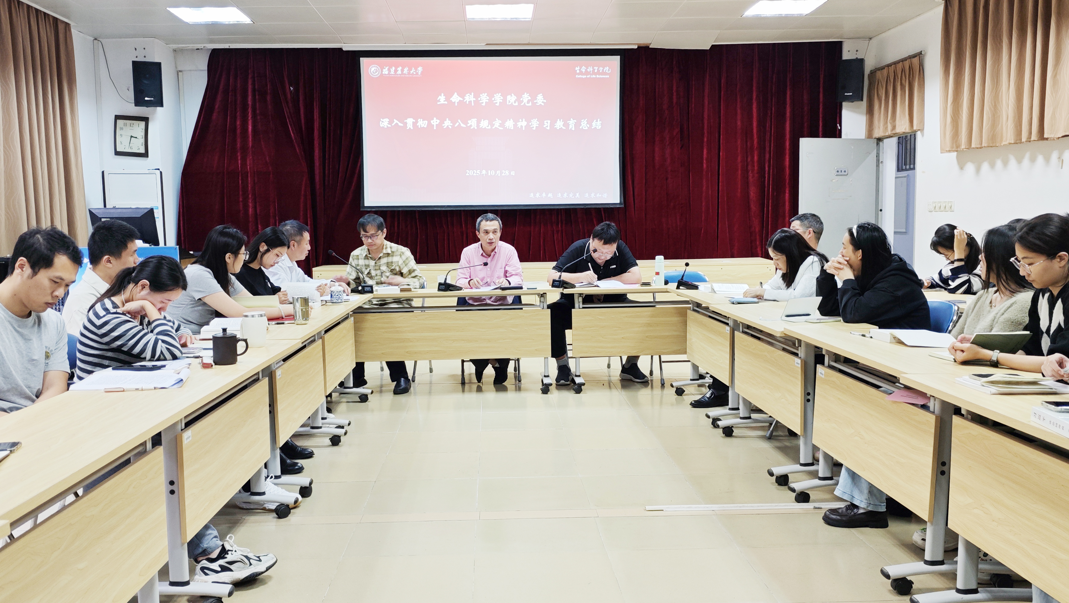 10月28日,生命科学学院党委在生科楼召开深入贯彻中央八项规定精神学习教育(以下简称学习教育)总结会。学院党委委员、党支部书记、科级干部及系主任参加会议,会议由学院党委书记主持。会议首先传达学习习近平总书记关于作风建设的重要指示精神,随后全面总结学习教育开展以来的工作成效:自启动以来,学院党委严格对标校党委部署,聚焦教学科研、人才培养、社会服务等核心任务,通过“专题学习+案例剖析+问题查摆”的模式,推动学查改一体推进,不仅筑牢了全院党员干部的思想根基,更在凝聚学院发展合力上取得良好成效。
