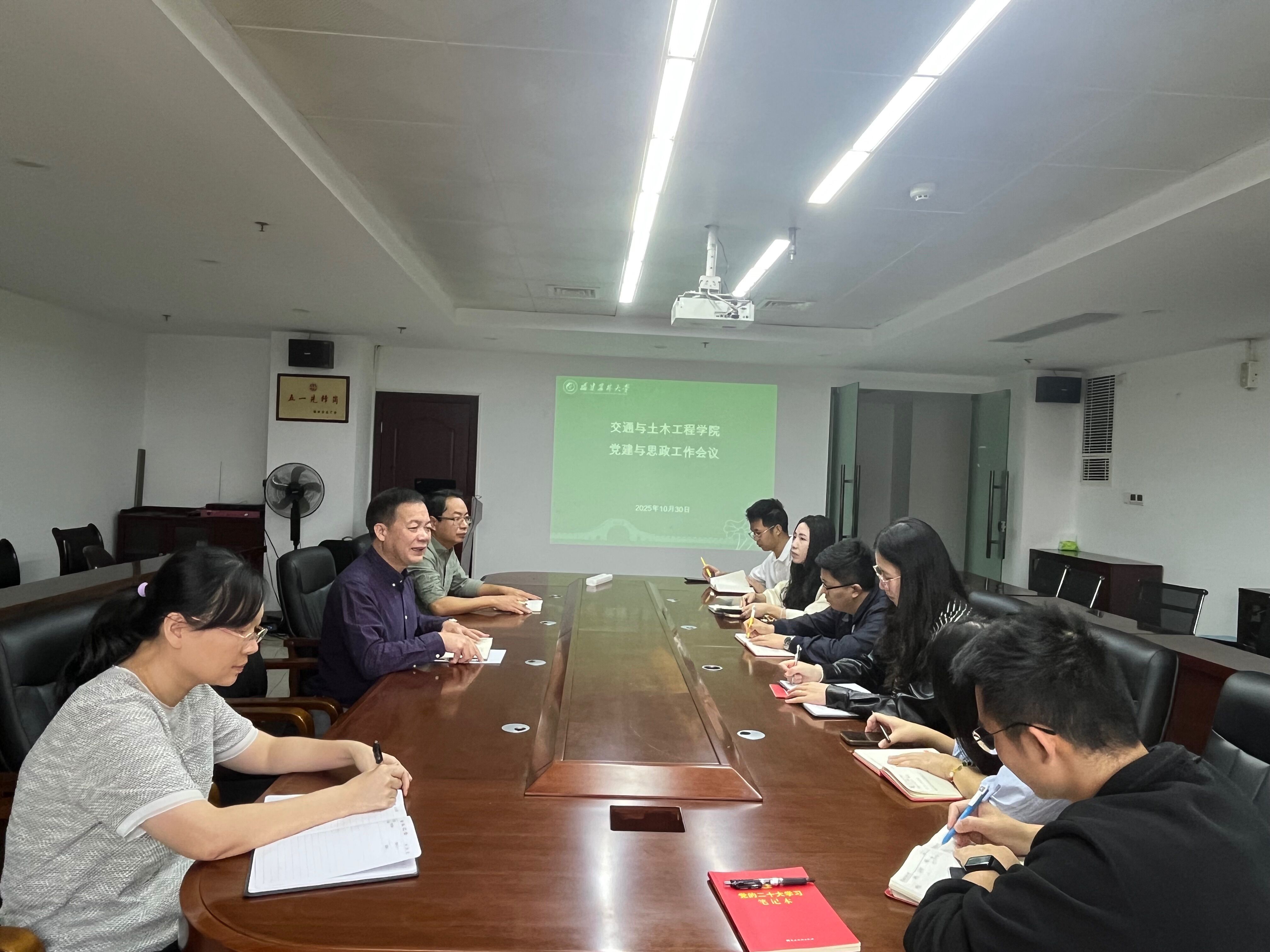 10月30日,交通与土木工程学院党委在仁德楼501会议室召开党建与思政工作会议。学院党委书记陈为德主持会议,学院党委副书记李治洲、党委组织员林燕、学院各级辅导员、学生党支部书记参加。
