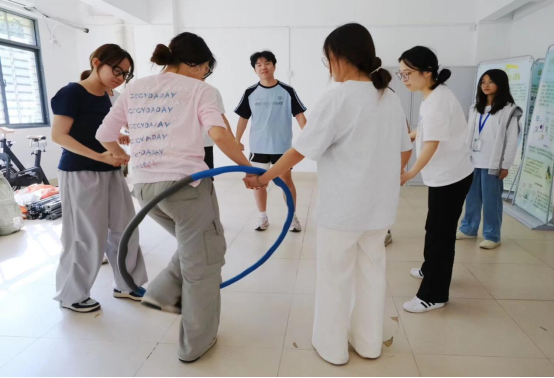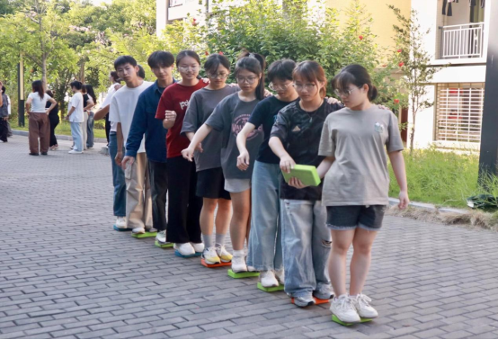 本次活动设有“一圈到底”“袋鼠赛跑”“鼓舞飞扬”“摸石过河”和“奋力投掷”五个项目。在“一圈到底”环节中,队员们紧紧牵住彼此的手,灵活调整姿势传递呼啦圈,齐心协力完成“一圈”挑战;在“袋鼠赛跑”关卡里,学子们双手提袋、双脚并拢向前跃,交接区的击掌声清脆响亮,接力节奏紧凑有序。